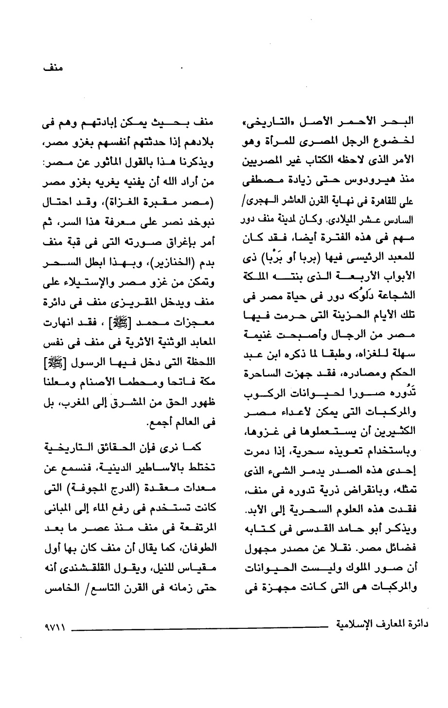البحر الأحمر الأصل "التاريخى" لخضوع الرجل المصرى للمرأة وهو الأمر الذى لاحظه الكتاب غير المصريين منذ هيرودوس حتى زيادة مصطفى على للقاهرة فى نهاية القرن العاشر الهجرى/ السادس عشر الميلادى. وكان لمدينة منف دور مهم فى هذه الفترة أيضا، فقد كان للمعبد الرئيسى فيها (بربا أو بَرْبا) ذى الأبواب الأربعة الذى بنته الملكة الشجاعة دَلوُكه دور فى حياة مصر فى تلك الأيام الحزينة التى حرمت فيها مصر من الرجال وأصبحت غنيمة سهلة للغزاه، وطبقا لما ذكره ابن عبد الحكم ومصادره، فقد جهزت الساحرة تَدُوره صورا لحيوانات الركوب والمركبات التى يمكن لأعداء مصر الكثيرين أن يستعملوها فى غزوها، وباستخدام تعويذه سحرية، إذا دمرت إحدى هذه الصدر يدمر الشئ الذى تمثله، وبانقراض ذرية تدوره فى منف، فقدت هذه العلوم السحرية إلى الأبد. ويذكر أبو حامد القدسى فى كتابه فضائل مصر. نقلا عن مصدر مجهول أن صور الملوك وليست الحيوانات والمركبات هى التى كانت مجهزة فى منف بحيث يمكن إبادتهم وهم فى بلادهم إذا حدثتهم أنفسهم بغزو مصر، ويذكرنا هذا بالقول المأثور عن مصر: من أراد اللَّه أن يفنيه يغريه بغزو مصر (مصر مقبرة الغزاة)، وقد احتال نبوخد نصر على معرفة هذا السر، ثم أمر بإغراق صورته التى فى قبة منف بدم (الخنازير)، وبهذا أبطل السحر وتمكن من غزو مصر والإستيلاء على منف ويدخل المقريزى منف فى دائرة معجزات محمد [-صلى اللَّه عليه وسلم-]، فقد انهارت المعابد الوثنية الأثرية فى منف فى نفس اللحظة التى دخل فيها الرسول [-صلى اللَّه عليه وسلم-] مكة فاتحا ومحطما الأصنام ومعلنا ظهور الحق من المشرق إلى المغرب، بل فى العالم أجمع.