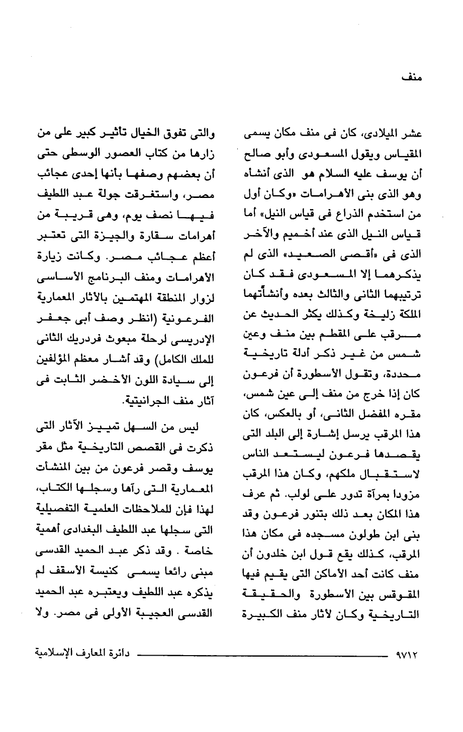 عشر الميلادى، كان فى منف مكان يسمى المقياس ويقول المسعودى وأبو صالح أن يوسف عليه السلام هو الذى أنشأه وهو الذى بنى الأهرامات "وكان أول من استخدم الذراع فى قياس النيل" أما قياس النيل الذى عند أخميم والآخر الذى فى "أقصى الصعيد" الذى لم يذكرهما إلا المسعودى فقد كان ترتيبهما الثانى والثالث بعده وأنشأتهما الملكة زليخة وكذلك يكثر الحديث عن مرقب على المقطم بين منف وعين شمس من غير ذكر أدلة تاريخية محددة، وتقول الأسطورة أن فرعون كان إذا خرج من منف إلى عين شمس، مقره المفضل الثانى، أو بالعكس، كان هذا المرقب يرسل إشارة إلى البلد التى يقصدها فرعون ليستعد الناس لاستقبال ملكهم، وكان هذا المرقب مزودا بمرآة تدور على لولب. ثم عرف هذا المكان بعد ذلك بتنور فرعون وقد بنى ابن طولون مسجده فى مكان هذا المرقب، كذلك يقع قول ابن خلدون أن منف كانت أحد الأماكن التى يقيم فيها المقوقس بين الأسطورة والحقيقة التاريخية وكان لأثار منف الكبيرة والتى تفوق الخيال تأثير كبير على من زارها من كتاب العصور الوسطى حتى أن بعضهم وصفها بأنها إحدى عجائب مصر، واستغرقت جولة عبد اللطيف فيها نصف يوم، وهى قريبة من أهرامات سقارة والجيزة التى تعتبر أعظم عجائب مصر. وكانت زيارة الأهرامات ومنف البرنامج الأساسى لزوار المنطقة المهتمين بالأثار المعمارية الفرعونية (انظر وصف أبى جعفر الإدريسى لرحلة مبعوث فردريك الثانى للملك الكامل) وقد أشار معظم المؤلفين إلى سيادة اللون الأخضر الثابت فى آثار منف الجرانيتية.