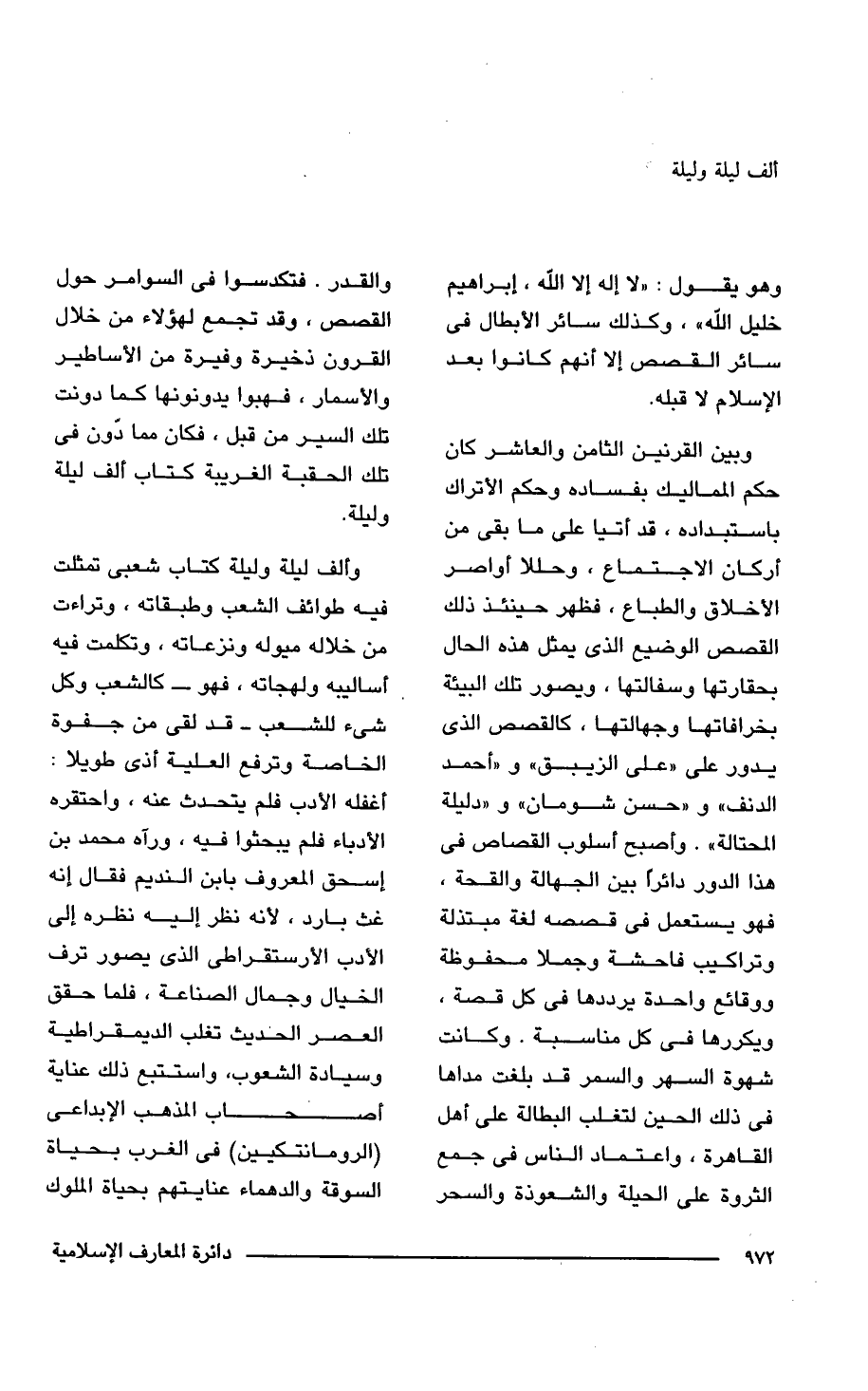 وألف ليلة وليلة كتاب شعبى تمثلت فيه طوائف الشعب وطبقاته، وتراءت من خلاله ميوله ونزعاته، وتكلمت فيه أساليبه ولهجاته، فهو -كالشعب وكل شئ للشعب - قد لقى من جفوة الخاصة وترفع العلية أذى طويلا: أغفله الأدب فلم يتحدث عنه، واحتقره الأدباء فلم يبحثوا فيه، ورآه محمد بن إسحق المعروف بابن النديم فقال إنه غث بارد، لأنه نظر إليه نظره إلى الأدب الأرستقراطى الذى يصور ترف الخيال وجمال الصناعة، فلما حقق العصر الحديث تغلب الديمقراطية وسيادة الشعوب، واستتبع ذلك عناية أصحاب المذهب الإبداعى (الرومانتكيين) فى الغرب بحياة السوقة والدهماء عنايتهم بحياة الملوك