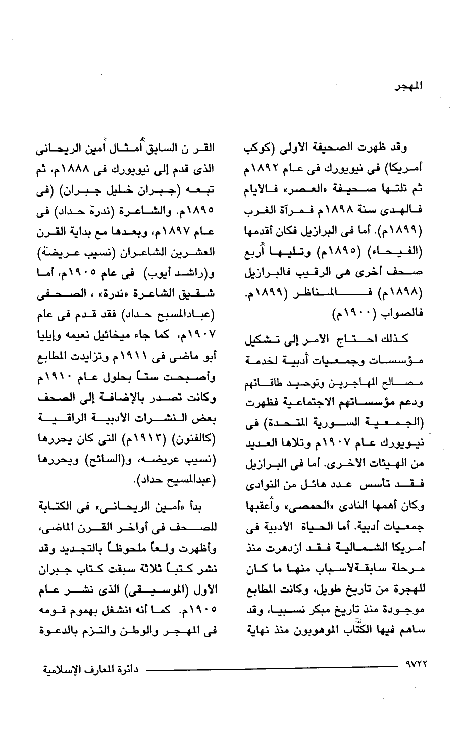 وقد ظهرت الصحيفة الأولى (كوكب أمريكا) فى نيويورك فى عام 1892 م ثم تلتها صحيفة "العصر" فالأيام فالهدى سنة 1898 م فمرآة الغرب (1899 م). أما فى البرازيل فكان أقدمها (الفيحاء) (1895 م) وتليها أربع صحف أخرى هى الرقيب فالبرازيل (1898 م) فالمناظر (1899 م) فالصواب (1900 م).