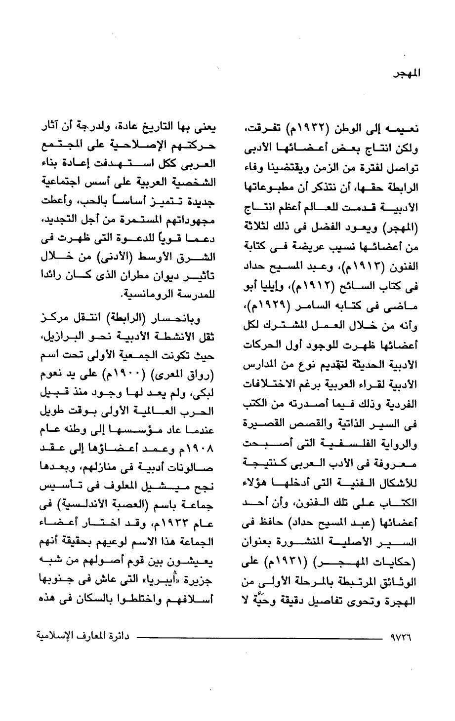 نعيمه إلى الوطن (1932 م) تفرقت، ولكن انتاج بعض أعضائها الأدبى تواصل لفترة من الزمن ويقتضينا وفاء الرابطة حقها، أن نتذكر أن مطبوعاتها الأدبية قدمت للعالم أعظم انتاج (المهجر) ويعود الفضل فى ذلك لثلاثة من أعضائها نسيب عريضة فى كتابة الفنون (1913 م)، وعبد المسيح حداد فى كتاب السائح (1912 م)، وإيليا أبو ماضى فى كتابه السامر (1929 م)، وأنه من خلال العمل المشترك لكل أعضائها ظهرت للوجود أول الحركات الأدبية الحديثة لتقديم نوع من المدارس الأدبية لقراء العربية برغم الاختلافات الفردية وذلك فيما أصدرته من الكتب فى السير الذاتية والقصص القصيرة والرواية الفلسفية التى أصبحت معروفة فى الأدب العربى كنتيجة للأشكال الفنية التى أدخلها هؤلاء الكتاب على تلك الفنون، وأن أحد أعضائها (عبد المسيح حداد) حافظ فى السير الأصلية المنشورة بعنوان (حكايات المهجر) (1931 م) على الوثائق المرتبطة بالمرحلة الأولى من الهجرة وتحوى تفاصيل دقيقة وحَيَّة لا يعنى بها التاريخ عادة، ولدرجة أن آثار حركتهم الإصلاحية على المجتمع العربى ككل استهدفت إعادة بناء الشخصية العربية على أسس اجتماعية جديدة تتميز أساسًا بالحب، وأعطت مجهوداتهم المستمرة من أجل التجديد، دعما قويًا للدعوة التى ظهرت فى الشرق الأوسط (الأدنى) من خلال تأثير ديوان مطران الذى كان رائدا للمدرسة الرومانسية.