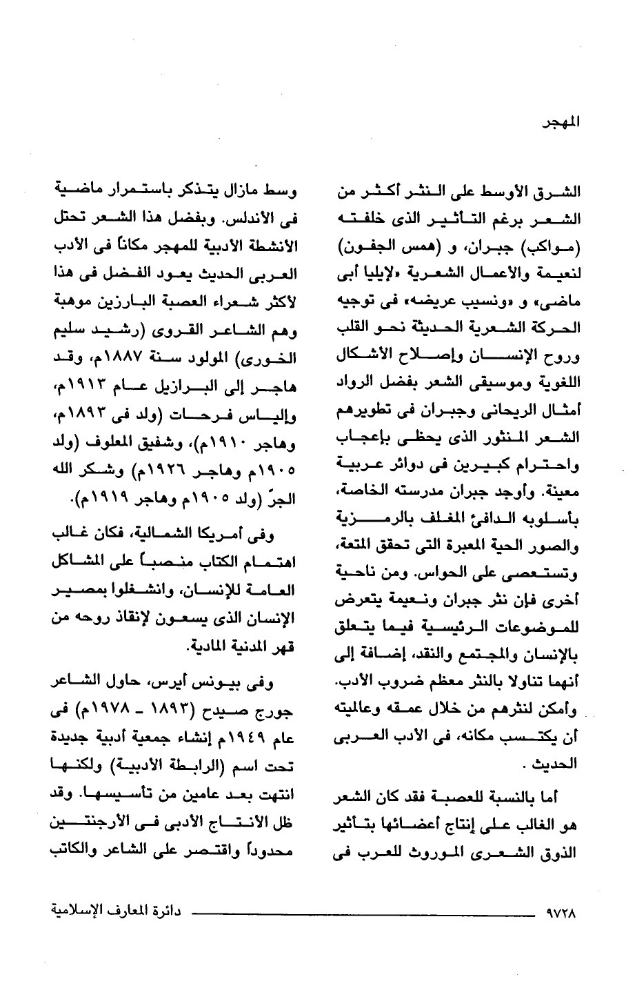 الشرق الأوسط على النثر أكثر من الشعر برغم التأثير الذى خلفته (مواكب) جبران، و (همس الجفون) لنعيمة والأعمال الشعرية "لإيليا أبى ماضى" و"ونسيب عريضه" فى توجيه الحركة الشعرية الحديثة نحو القلب وروح الإنسان وإصلاح الأشكال اللغوية وموسيقى الشعر بفضل الرواد أمثال الريحانى وجبران فى تطويرهم الشعر المنثور الذى يحظى بإعجاب واحترام كبيرين فى دوائر عربية معينة. وأوجد جبران مدرسته الخاصة، بأسلوبه الدافئ المغلف بالرمزية والصور الحية المعبرة التى تحقق المتعة، وتستعصى على الحواس. ومن ناحية أخرى فإن نثر جبران ونعيمة يتعرض للموضوعات الرئيسية فيما يتعلق بالإنسان والمجتمع والنقد، إضافة إلى أنهما تناولا بالنثر معظم ضروب الأدب. وأمكن لنثرهم من خلال عمقه وعالميته أن يكتسب مكانه، فى الأدب العربى الحديث.