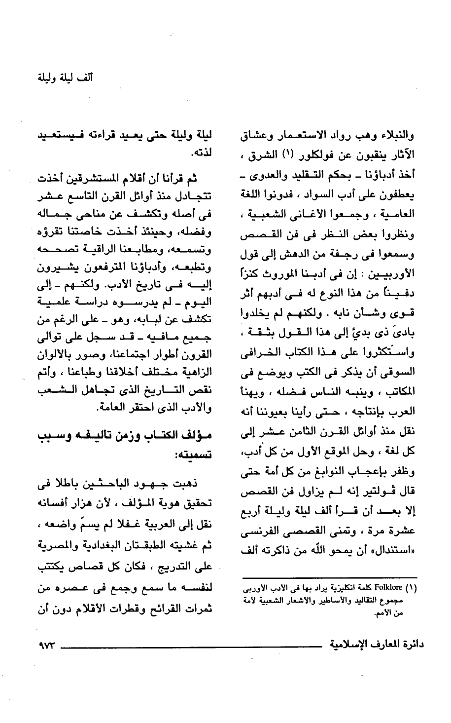 والنبلاء وهب رواد الاستعمار وعشاق الآثار ينقبون عن فولكور (¬1) الشرق، أخذ أدباؤنا -بحكم التقليد والعدوى- يعطفون على أدب السواد، فدونوا اللغة العامية، وجمعوا الأغانى الشعبية، ونظروا بعض النظر فى فن القصص وسمعوا فى رجفة من الدهش إلى قول الأوربيين: إن فى أدبنا الموروث كنزلم دفينا من هذا النوع له فى أدبهم أثر قوى وشأن نابه. ولكنهم لم يخلدوا بادىَ ذى بدئ إلى هذا القول بثقة، واستكثروا على هذا الكتاب الخرافى السوقى أن يذكر فى الكتب ويوضع فى المكاتب، وينبه الناس فضله، ويهنأ العرب بإنتاجه، حتى رأينا بعيوننا أنه نقل منذ أوائل القرن الثامن عشر إلى كل لغة، وحل الموقع الأول من كل أدب، وظفر بإعجاب النوابغ من كل أمة حتى قال فولتير إنه لم يزاول فن القصص إلا بعد أن قرأ ألف ليلة وليلة أربع عشرة مرة، وتمنى القصصى الفرنسى "استندال" أن يمحو الله من ذاكرته ألف ليلة وليلة حتى يعيد قراءته فيستعيد لذته.