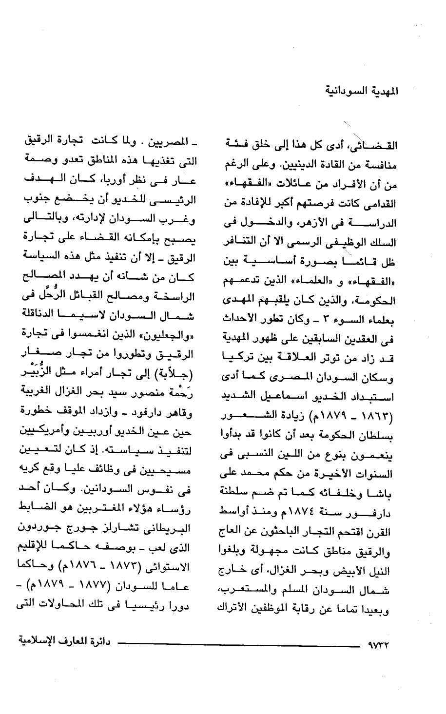 3 - وكان تطور الأحداث فى العقدين السابقين على ظهور المهدية قد زاد من توتر العلاقة بين تركيا وسكان السودان المصرى كما أدى استبداد الخديو اسماعيل الشديد (1863 - 1879 م) زيادة الشعور بسلطان الحكومة بعد أن كانوا قد بدأوا ينعمون بنوع من اللين النسبى فى السنوات الأخيرة من حكم محمد على باشا وخلفائه كما تم ضم سلطنة دارفور سنة 1874 م ومنذ أواسط القرن اقتحم التجار الباحثون عن العاج والرقيق مناطق كانت مجهولة وبلغوا النيل الأبيض وبحر الغزال، أى خارج شمال السودان المسلم والمستعرب، وبعيدا تماما عن رقابة الموظفين الأتراك - المصريين. ولما كانت تجارة الرقيق التى تغذيها هذه المناطق تعدو وصمة عار فى نظر أوربا، كان الهدف الرئيسى للخديو أن يخضع جنوب وغرب السودان لأدارته، وبالتالى يصبح بإمكانه القضاء على تجارة الرقيق -إلا أن تنفيذ مثل هذه السياسة كان من شأنه أن يهدد المصالح الراسخة ومصالح القبائل الرُّحَّل فى شمال السودان لا سيما الدناقلة "والجعليون" الذين انغمسوا فى تجارة الرقيق وتطوروا من تجار صغار (جلّابة) إلى تجار أمراء مثل الزُّبَيْر رَحْمة منصور سيد بحر الغزال الغريبة وقاهر دارفود- وازداد الموقف خطورة حين عين الخديو أوربيين وأمريكيين لتنفيذ سياسته. إذ كان لتعيين مسيحيين فى وظائف عليا وقع كريه فى نفوس السودانين. وكان أحد رؤساء هؤلاء المغتربين هو الضابط البريطانى تشارلز جورج جوردون الذى لعب -بوصفه حاكما للإقليم الاستوائى (1873 - 1876 م) وحاكما عاما للسودان (1877 - 1879 م) - دورا رئيسيا فى تلك المحاولات التى