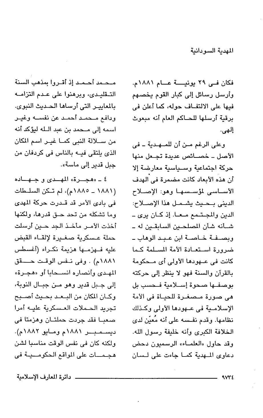 4 - " هجرة" المهدى وجهاده (1881 - 1885 م)، لم تكن السلطات فى بادئ الأمر قد قدرت حركة المهدى وما تشكله من تحد حق قدرها، ولكنها أخذت الأمر مأخذ الجد حين أرسلت حملة عسكرية صغيرة لإلقاء القبض عليه فهزمها هزيمة نكراء (أغسطس 1881 م). وفى نفس الوقت حقق المهدى وأنصاره انسحابا أو "هجرة" إلى جبل قدير وهو من جبال النوبة، وكان المكان من البعد بحيث أصبح تجريد الحملات العسكرية عليه أمرا صعبا فقد جردت حملتان وهزمتا فى ديسمبر 1881 م ومايو 1882 م). ولكنه كان فى نفس الوقت مناسبا لشن هجمات على المواقع الحكومية فى