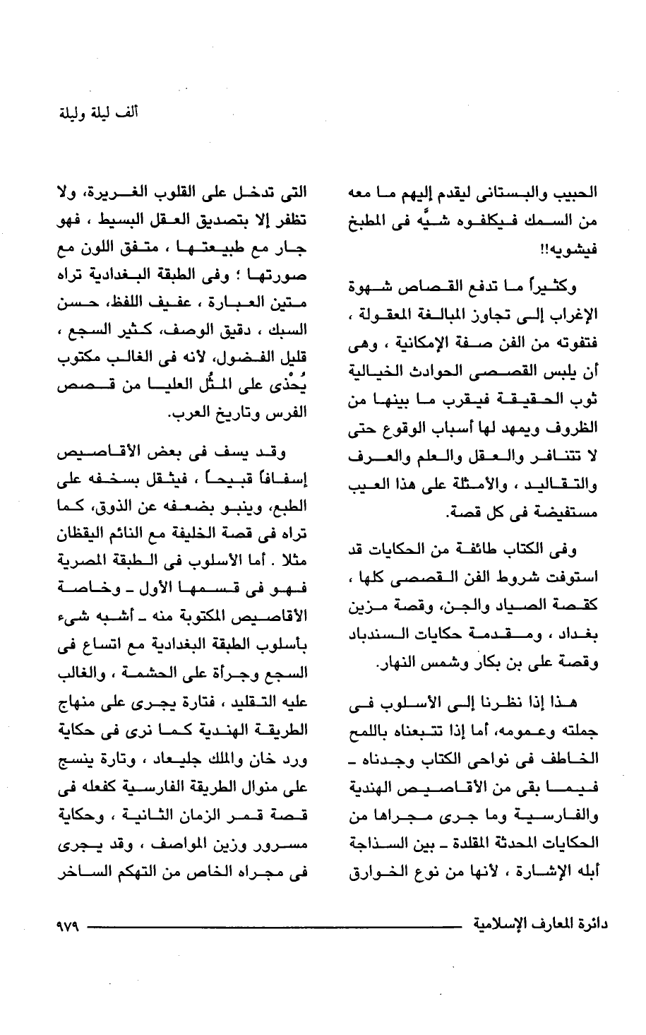 وقد يسف فى بعض الأقاصيص إسفافا قبيحا، فيثقل بسخفه على الطبع، وينبو بضعفه عن الذوق، كما تراه فى قصة الخليفة مع النائم اليقظان مثلا. أما الأسلوب فى الطبقة المصرية فهو فى قسمها الأول -وخاصة الأقاصيص المكتوبة منه- أشبه شئ باسلوب الطبقة البغدادية مع اتساع فى السجع وجرأة على الحشمة، والغالب عليه التقليد، فتارة يجرى على منهاج الطريقة الهندية كما نرى فى حكاية ورد خان والملك جليعاد، وتارة ينسج على منوال الطريقة الفارسية كفعله فى قصة قمر الزمان الثانية، وحكاية مسرور وزين المواصف، وقد يجرى فى مجراه الخاص من التهكم الساخر