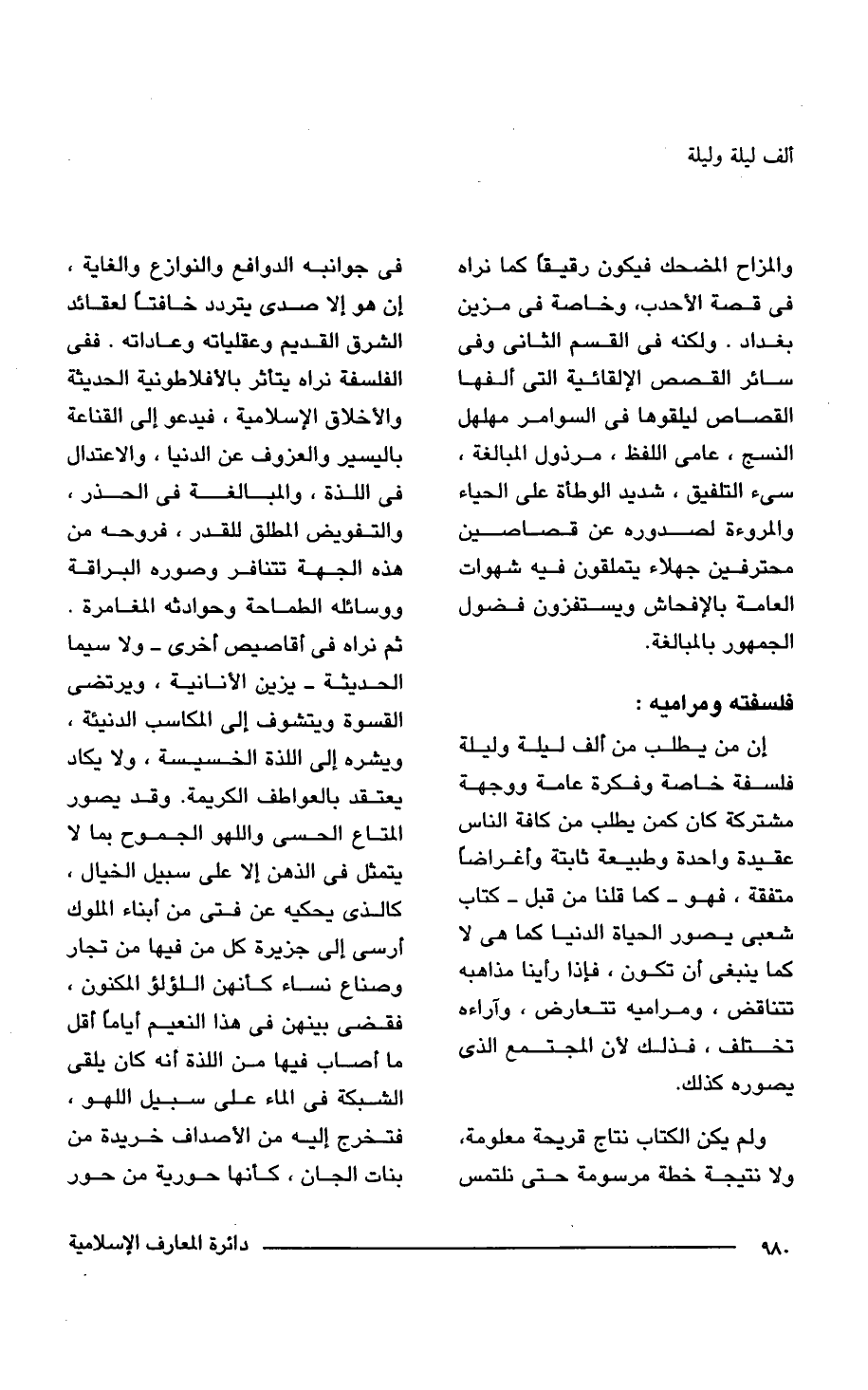 ولم يكن الكتاب نتاج قريحة معلومة، ولا نتيجة خطة مرسومة حتى نلتمس فى جوانبه الدوافع والنوازع والغاية، إن هو إلا صدى يتردد خافتا لعقائد الشرق القديم وعقلياته وعاداته. ففى الفلسفة نراه يتأثر بالأفلاطونية الحديثة والأخلاق الإسلامية، فيدعو إلى القناعة باليسير والعزوف عن الدنيا، والاعتدال فى اللذة، والمبالغة فى الحذر، والتفويض المطلق للقدر، فروحه من هذه الجهة تتنافر وصوره البراقة ووسائله الطماحة وحوادثه المغامرة. ثم نراه فى أقاصيص أخرى -ولا سيما الحديثة- يزين الأنانية، ويرتضى القسوة ويتشوف إلى المكاسب الدنيئة، ويشره إلى اللذة الخسيسة، ولا يكاد يعتقد بالعواطف الكريمة. وقد يصور المتاع الحسى واللهو الجموح بما لا يتمثل فى الذهن إلا على سبيل الخيال، كالذى يحكيه عن فتى من أبناء الملوك أرسى إلى جزيرة كل من فيها من تجار وصناع نساء كأنهن اللؤلؤ المكنون، فقضى بينهن فى هذا النعيم أياما اقل ما أصاب فيها من اللذة أنه كان يلقى الشبكة فى الماء على سبيل اللهو، فتخرج إليه من الأصداف خريدة من بنات الجان، كأنها حورية من حور