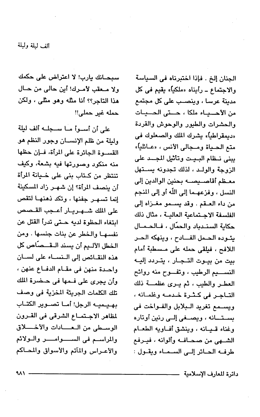 الجنان إلخ. فإذا اختبرناه فى السياسة والاجتماع- رأيناه "ملكياً" يقيم فى كل مدينة عرسا، وينصب على كل مجتمع من الأحياء ملكا، حتى الحيات والحشرات والطيور والوحوش والقردة "ديمقراطياً" يشرك اللك والصعلوك فى متع الحياة ومجالى الأنس، "عائلياً" يبنى نظام البيت وتأثيل المجد على الزوجة والولد، لذلك تجدونه يستهل معظم أقاصيصه بحنين الوالدين إلى النسل، وفزعهما إلى الله أو إلى المنجم من داء العقم. وقد يسمو مغزاه إلى الفلسفة الاجتماعية العالية، مثال ذلك حكاية السندباد والحمّال، فالحمال يئوده الحمل الفادح، وينهكه الحر اللافح، فيلقى حمله على مسطبة أمام بيت من بيوت التجار، يتردد إليه النسيم الرطيب، وتفوح منه روائح العطر والطيب، ثم يرى عظمة ذلك التاجر فى كثرة خدمه وغلمانه، ويسمع تغريد البلابل والفواخت فى بستانه، ويصغى إلى رنين أوتاره وغناء قيانه، وينشق أفاويه الطعام الشهى من صحافه وألوانه، فيرفع طرفه الحائر إلى السماء ويقول: سبحانك يارب! لا اعتراض على حكمك ولا معقب لأمرك! أين حالى من حال هذا التاجر؟ ؟ أنا مثله وهو مثلى، ولكن حمله غير حملى إ!