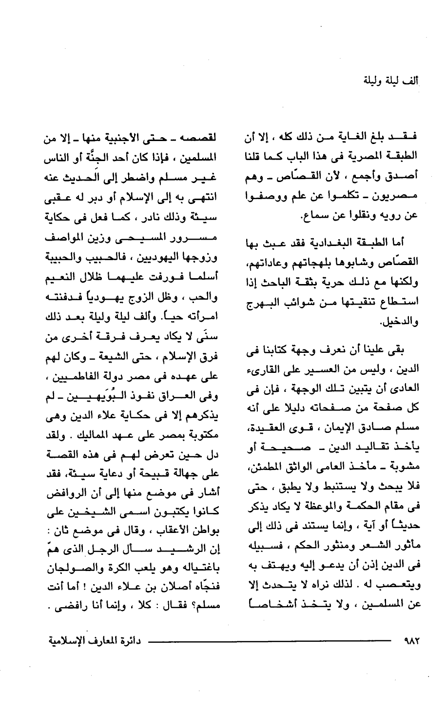 بقى علينا أن نعرف وجهة كتابنا فى الدين، وليس من العسير على القارئ العادى أن يتبين تلك الوجهة، فإن فى كل صفحة من صفحاته دليلا على أنه مسلم صادق الإيمان، قوى العقيدة، يأخذ تقاليد الدين -صحيحة أو مشوبة- مأخذ العاص الواثق المطمئن، فلا يبحث ولا يستنبط ولا يطبق، حتى فى مقام الحكمة والموعظة لا يكاد يذكر حديثا أو آية، وإنما يستند فى ذلك إلى مأثور الشعر ومنثور الحكم، فسبيله فى الدين إذن أن يدعو إليه ويهتف به ويتعصب له. لذلك نراه لا يتحدث إلا عن المسلمين، ولا يتخذ أشخاصاً لقصصه -حتى الأجنبية منها- إلا من المسلمين، فإذا كان أحد الجنة أو الناس غير مسلم واضطر إلى الَحديث عنه انتهى به إلى الإسلام أو دبر له عقبى سيئة وذلك نادر، كما فعل فى حكاية مسرور المسيحى وزين المواصف وزوجها اليهوديين، فالحبيب والحبيبة أسلما فورفت عليهما ظلال النعيم والحب، وظل الزوج يهوديا فدفنته امرأته حياً. وألف ليلة وليلة بعد ذلك سنَى لا يكاد يعرف فرقة أخرى من فرق الإسلام، حتى الشيعة -وكان لهم على عهده فى مصر دولة الفاطميين، وفى العراق نفوذ البُوَيهيين- لم يذكرهم إلا فى حكاية علاء الدين وهى مكتوبة بمصر على عهد المماليك. ولقد دل حين تعرض لهم فى هذه القصة على جهالة قبيحة أو دعاية سيئة، فقد أشار فى موضع منها إلى أن الروافض كانوا يكتبون اسمى الشيخين على بواطن الأعقاب، وقال فى موضع ثان: إن الرشيد سأل الرجل الذى همّ باغتياله وهو يلعب الكرة والصولجان فنجّاه أصلان بن علاء الدين! أما أنت مسلم؟ فقال: كلا، وإنما أنا رافضى.