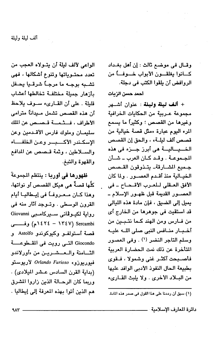 + ألف ليلة وليلة: عنوان أشهر مجموعة عربية من الحكايات الخرافية وغيرها من القصص؛ وكثيراً ما يسمع المرء اليوم عبارة "مثل قصة خيالية من قصص ألف ليلة"، والحق إن القصص الخيالية هى أبرز جزء فى هذه المجموعة. وقد كان العرب -شأن جميع المشارقة- يتذوقون القصص الخيالية منذ أقدم العصور. ولما كان الأفق العقلى للعرب الأقحاح -فى العصور القديمة قبل ظهور الإسلام- يميل إلى الضيق، فإن مادة هذه الليالى قد استقيت فى جوهرها من الخارج أى من فارس ومن الهند كما نتبين من أخبار منافس النبى صلى الله عليه وسلم التاجر النضر (¬1). وفى العصور المتأخرة عن ذلك نمت الحضارة العربية فأصبحت أكثر غنى وشمولا، فقوى بطبيعة الحال النفوذ الأدبى الوافد عليها من البلاد الأخرى. ولا يلبث القارئ الواعى لألف ليلة أن يتولاه العجب من تعدد محتوياتها وتنوع أشكالها، فهى تشبه بوجه ما مرجاً شرقيا يحفل بأزهار جميلة مختلفة تخالطها أعشاب قليلة. على أن القارئ سوف يلاحظ أن هذه القصص تشمل ميداناً مترامى الأطراف، فثمة قصص عن الملك سليمان وملوك فارس الأقدمين وعن الإسكندر الأكبر وعن الخلفاء والسلاطين، وثمة قصص عن المدافع والقهوة والتبغ.