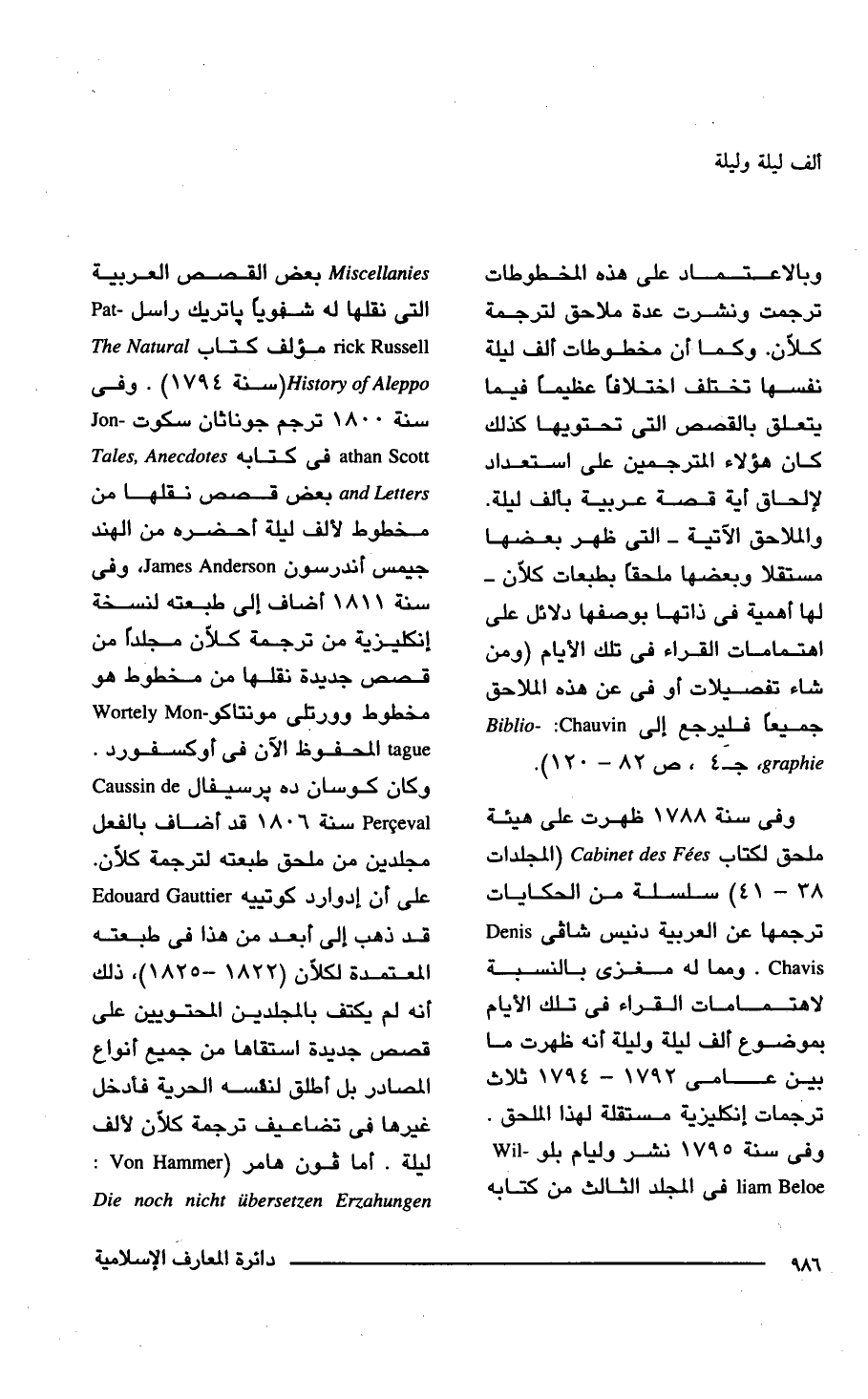 وفى سنة 1788 ظهرت على هيئة ملحق لكتاب Cabinet des Fees (المجلدات 38 - 41) سلسلة من الحكايات ترجمها عن العربية دنيس شافى Denis Chavis . ومما له مغزى بالنسبة لاهتمامات القراء فى تلك الأيام بموضوع ألف ليلة وليلة أنه ظهرت ما بين عامى 1792 - 1794 ثلاث ترفجمات إنكليزية مستقلة لهذا الملحق. وفى سنة 1795 نشر وليام بلو Liam Beloe فى المجلد الثالث من كتابه Miscellanies بعض القصص العربية التى نقلها له شفويا باتريك راسل - Pat L rick Russell مؤلف كتاب History of Aleppo (سنة 1794). وفى سنة 1800 ترجم جوناثان سكوت athan Scott فى كتابه and Ietter.c بعض قصص نقلها من مخطوط لألف ليلة أحضره من الهند جيمس اندرسون james Anderson وفى سنة 1811 أضاف إلى طبعته لنسخة إنكليزية من ترجمة كلاّن مجلداً من قصص جديدة نقلها من مخطوط هو مخطوط ووتلي لبهى مونتاكو ague[المحفوظ الآن فى أوكسفورد. وكان كوسان ده يرسيفال Perceval سنة 1806 قد أضاف بالفعل مجلدين من ملحق طبعته لترجمة كلّان. على أن إدوارد كوتييه Fdnuard Gauttier قد ذهب إلى أبعد من هذا فى طبعته المعتمدة لكلان (1822 - 1825) , ذلك أنه لم يكتف بالمجلدين المحتويين على قصص جديدة استقاها من جميع أنواع المصادر بل أطلق لنفسه الحرية فأدخل غيرها فى تضاعيف ترجمة كلّان لألف ليلة. أما فون هامر (Von Hammer: Die noch nicht iibersetzen Erzahungen