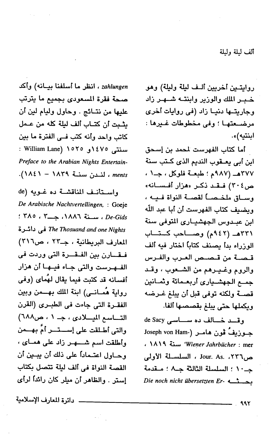 وقد خالف ده ساسى de Sacy جوزيفُ فون هامر) - Joseph von Ham Wiener Jahrbücher: mer` سنة 1819. ص 236، Jour. As. , السلسلة الأولى جـ 10: السلسلة الثالثة جـ 8؛ مقدمة بحثه - übersetzten Er Die noch nicht zahlungen, انظر ما أسلفنا بيانه) وأكد صحة فقرة المسعودى بجميع ما يترتب عليها من نتائج. وحاول وليام لين أن يثبت أن كتاب ألف ليلة كله من عمل كاتب واحد وأنه كتب فى الفترة ما بين سنتي 1475 و 1525) William Lane: -Preface to the Arabian Nights Entertain ments , لندن سنة 1839 - 1841).
