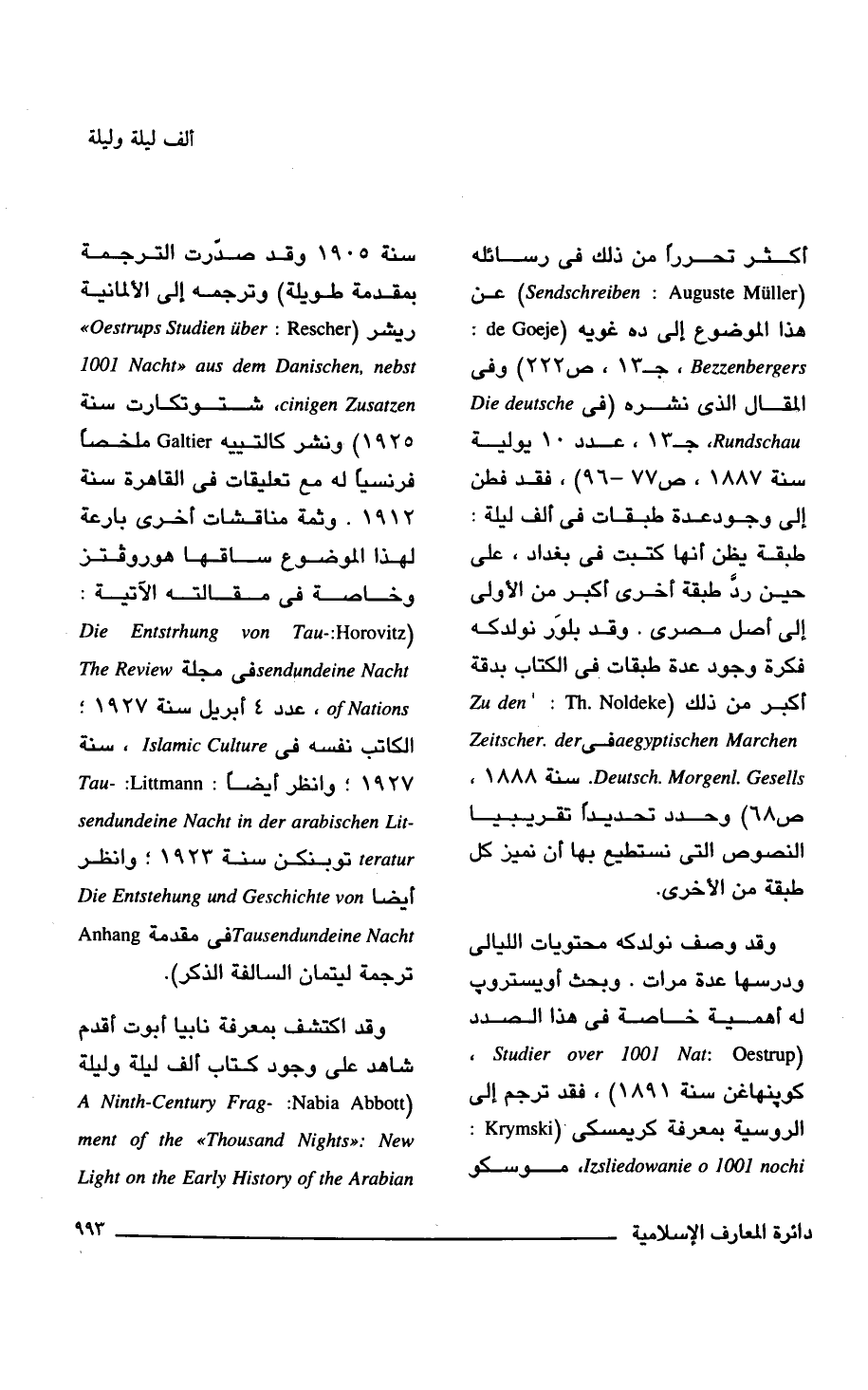 وقد وصف نولدكه محتويات الليالى ودرسها عدة مرات. وبحث أويستروب له أهمية خاصة فى هذا الصدد) Studier over 1001 Nat: Oestrup، كوبنهاغن سنة 1891 (، فقد ترجم إلى الروسية بمعرمْة كريمسكى) Krymski: Izsliedowanie o 1001 noche، موسكو سنة 1905 وقد صدّرت الترجمة بمقدمة طويلة) وترجمه إلى الألمانية ريشر) " Oestrups Studien über: Rescher 1001 Nacht" aus dem Danischen, nebst cinigen Zusatzen, شتوتكارت سنة 1925) ونشر كالتييه Galtier ملخصاً فرنسياً له مع تعليقات فى القاهرة سنة 1912. وثمة مناقشات أخرى بارعة لهذا الموضوع ساقها هوروفتز وخاصة فى مقالته الآتية: ) Die Entstrhung von Tau-: Horovitz sendundeine Nacht فى مجلة The Review of Nations , عدد 4 أبريل سنة 1927؛ الكاتب نفسه فى Islamic Culture , سنة 1927؛ وانظر أيضاً: Tau-: Littmann -sendundeine Nacht in der arabischen Lit teratur توبنكن سنة 1923؛ وانظر أيضاً Die Entstehung und Geschichte von Tausendundeine Nacht فى مقدمة Anhang ترجمة ليتمان السالفة الذكر).