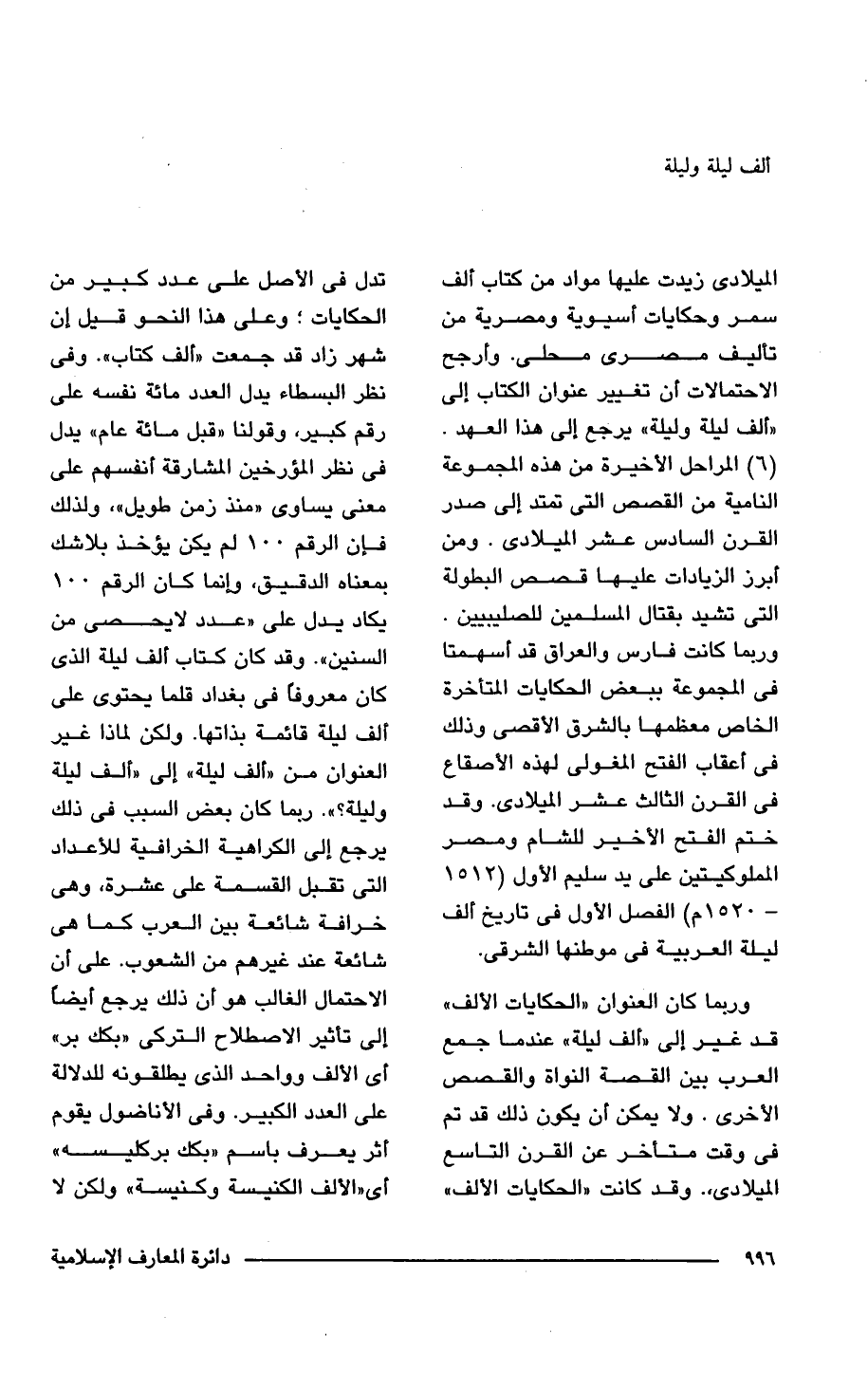 (6) المراحل الأخيرة من هذه المجموعة النامية من القصص التى تمتد إلى صدر القرن السادس عشر الميلادى. ومن أبرز الزيادات عليها قصص البطولة التى تشيد بقتال المسلمين للصليبيين. وربما كانت فارس والعراق قد أسهمتا فى المجموعة ببعض الحكايات المتأخرة الخاص معظمها بالشرق الأقصى وذلك فى أعقاب الفتح المغولى لهذه الأصقاع فى القرن الثالث عشر الميلادى. وقد ختم الفتح الأخير للشام ومصر المملوكيتين على يد سليم الأول (1512 - 1520 م) الفصل الأول فى تاريخ ألف ليلة العربية فى موطنها الشرقى.