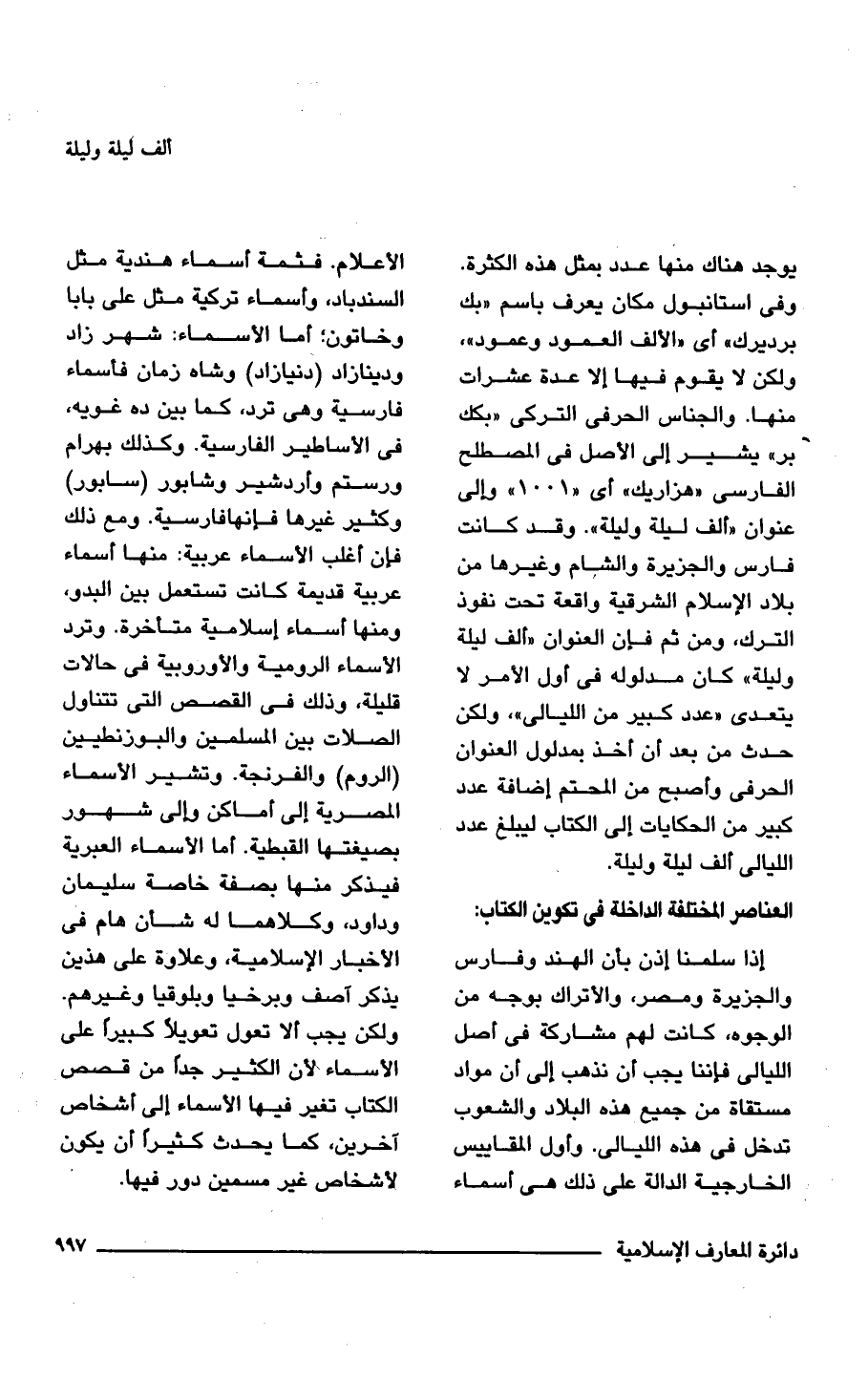 إذا سلمنا إذن بأن الهند وفارس والجزيرة ومصر، والأتراك بوجه من الوجوه، كانت لهم مشاركة فى أصل الليالى فإننا يجب أن نذهب إلى أن مواد مستقاة من جميع هذه البلاد والشعوب تدخل فى هذه الليالى. وأول المقاييس الخارجية الدالة على ذلك هى أسماء الأعلام. فثمة أسماء هندية مثل السندباد، وأسماء تركية مثل على بابا وخاتون؛ أما الأسماء: شهر زاد ودينازاد (دنيازاد) وشاه زمان فأسماء فارسية وهى ترد، كما بين ده غويه، فى الأساطير الفارسية. وكذلك بهرام ورستم واردشير وشابور (سابور) وكثير غيرها فإنها فارسية. ومع ذلك فإن أغلب الأسماء عربية: منها أسماء عربية قديمة كانت تستعمل بين البدو، ومنها أسماء إسلامية متأخرة. وترد الأسماء الرومية والأوروبية فى حالات قليلة، وذلك فى القصص التى تتناول الصلات بين المسلمين والبوزنطيين (الروم) والفرنجة. وتشير الأسماء المصرية إلى أماكن وإلى شهور بصيغتها القبطية. أما الأسماء العبرية فيذكر منها بصفة خاصة سليمان وداود، وكلاهما له شأن هام فى الأخبار الإسلامية، وعلاوة على هذين يذكر آصف وبرخيا وبلوقيا وغيرهم. ولكن يجب ألا تعول تعويلًا كبيراً على الأسماء لأن الكثير جدًا من قصص الكتاب تغير فيها الأسماء إلى أشخاص آخرين، كما يحدث كثيرًا أن يكون لأشخاص غير مسمين دور فيها.
