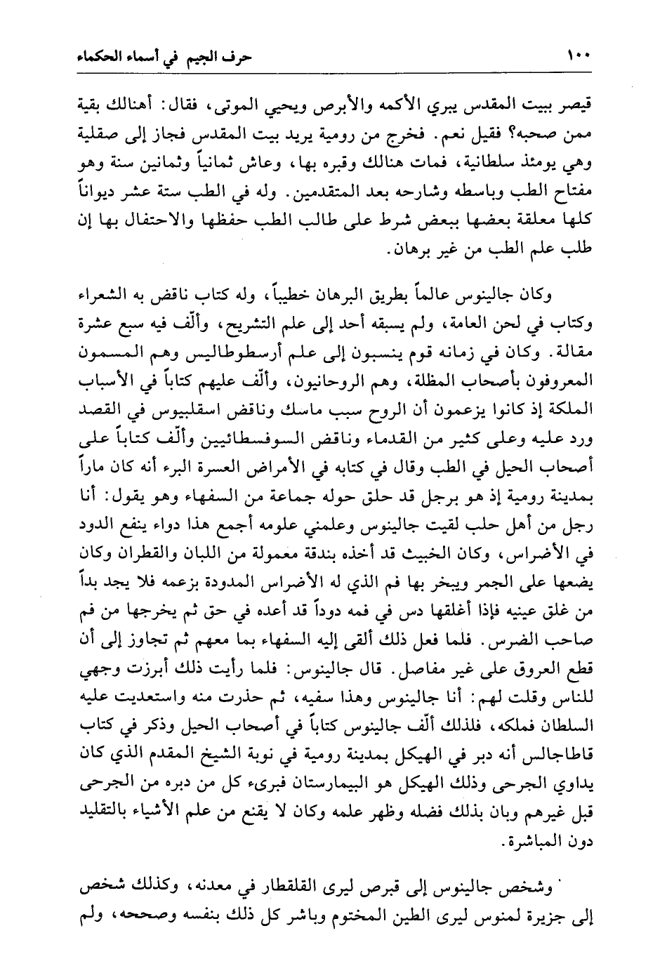 قيصر ببيت المقدس يبري الأكمه والأبرص ويحيي الموتى فقال أهنالك بقية ممن صحبه فقيل نعم فخرج من رومية يريد بيت المقدس فجاز إِلَى صقلية وهي يومئذ سلطانية فمات هنالك وقبره بِهَا وعاش ثمانياً وثمانين سنة وهو مفتاح الطب وباسطه وشارحه بعد المتقدمين وَلَهُ فِي الطب سنة عشر ديواناً كلها معلقة بعضها ببعض شرط عَلَى طالب الطب حفظها والاحتفال بِهَا أن طلب علم الطب من غير برهان وَكَانَ جالينوس عالماً بطريق البرهان خطيباً وَلَهُ كتاب ناقض بِهِ الشعراء وكتاب فِي لحن العامة وَلَمْ يسبقه أحد إِلَى علم التشريح وألف فِيهِ سبع عشرة مقالة وَكَانَ فِي زمانه قوم يمسبون إِلَى علم أرسطوطاليس وهم المسمون المعروفون بأصحاب المظلة وهم الروحانيون وألف عليهم كتاباً فِي الأسباب الملكة إذ كانوا يزعمون أن الروح سبب ماسك زناقض اسقلبياس فِي الفصد ورد عَلَيْهِ وَعَلَى كثير من القدماء وناقض السوفسطائيين وألف كتاباً عَلَى أصحاب الحيل فِي الطب وقال فِي كتابه فِي الأمراض العسرة البرء أنه كَانَ ماراً بمدينة رومية إذ هو برجل قَدْ حلق حوله جماعة من السفهاء وهو يقول أنا رجل من أهل حلب لقيت جالينوس وعلمني علومه أجمع هَذَا دواء ينفع الدود فِي الأضراس وَكَانَ الخبيث قَدْ أخذ بندقة معمولة من اللبان والقطران وَكَانَ يضعها عَلَى الجمر ويبخر بِهَا فم الَّذِي لَهُ الأضراس المدودة بزعمه فلا يجد بداً من غلق عينيه فإذا أغلقها دس فِي فمه دوداً قَدْ أغده فِي حق ثُمَّ يخرجها من فم صاحب الضرس فلما فعل ذَلِكَ ألقى إِلَيْهِ السفهاء بما معهم ثُمَّ تجاوز إِلَى أن قطع العروق عَلَى غير مفاصل قال جالينوس فلما رأيت ذَلِكَ أبرزت وجهي للناس وقلت لهم أنا جالينوس وهذا سفيه ثُمَّ حذرت منه واستعديت عَلَيْهِ السلطان فملكه فلذلك ألف جالينوس كتاباً فِي أصحاب الحيل وذكر فِي كتاب قاطاجالس أنه دير فِي الهيكل بمدينة رومية فِي نوبة الشيخ المقدم الَّذِي كَانَ يداوي الجرحى وذلك الهيكل هو البيمارستان فبرئ كل من دبره من الجرحى قبل غيرهم وبان بذلك فضله وظهر علمه وَكَانَ لا يقنع من علم الأشياء بالتقليد دون المباشرة وشخص جالينوس إِلَى قبرص ليرى القلقطار فِي معدنه وكذلك شخص إِلَى جزيرة لمنوس ليرى الطين المختوم وبار كل ذَلِكَ بنفسه وصححه وَلَمْ