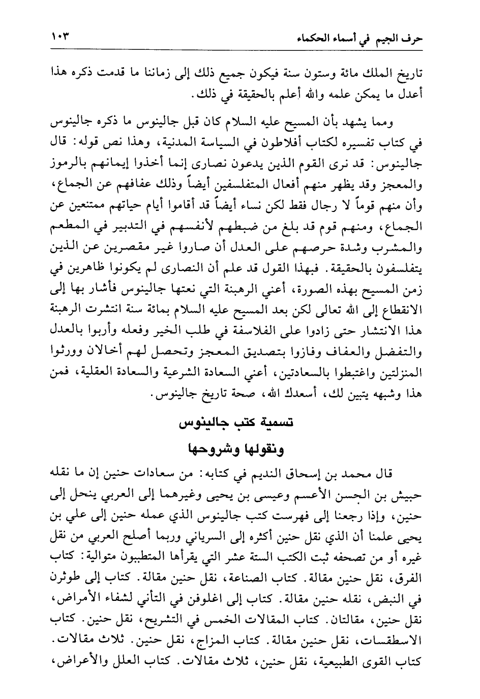 ومما يشهد بأن المسيح عَلَيْهِ السلام كَانَ قبل جالينوس فِي كتاب تفسيره لكتاب أفلاطون فِي السياسة المدنية وهذا نص قوله قال جالينوس قَدْ ترى القوم الذين يدعون النصارى إنما أخذوا إيمانهم بالرموز والمعجز وَقَدْ يظهر منهم أفعال المتفلسفين أيضاً وذلك عفافهم عن الجماع وأن منهم قوماً لا رجال فقط لكن نساء أيضاً قَدْ أقاموا أيام حياتهم ممتنعين عن الجماع ومنهم قوم قَدْ بلغ من ضبطهم لأنفسهم فِي التدبير فِي المطعم والمشرب وشدة حرصهم عَلَى العدل أن صاروا غير مقصرين عن الذين يتفلسفون بالحقيقة فبهذا القول قَدْ علم أن النصارى لَمْ يكونوا ظاهرين فِي زمن المسيح بهذه الصورة أعني الرهبنة التى نعتها جالينوس فأشار بِهَا إِلَى الانقطاع إِلَى الله تعالى لكن بعد المسيح عَلَيْهِ السلام بمائة سنة انتشرت الرهبنة هَذَا الانتشار حَتَّى زادوا عَلَى الفلاسفة فِي طلب الخير وفعله وأربوا بالعدل والتفضل والعفاف وفازوا بتصديق المعجز وتحصل لهم الحالان وورثوا المنزلتين واغتبطوا بالسعادتين أعني السعادة الشرعية والسعادة العقلية فمن هَذَا وشبهه يتبين لَكَ أسعدك الله صحة تاريخ جالينوس.