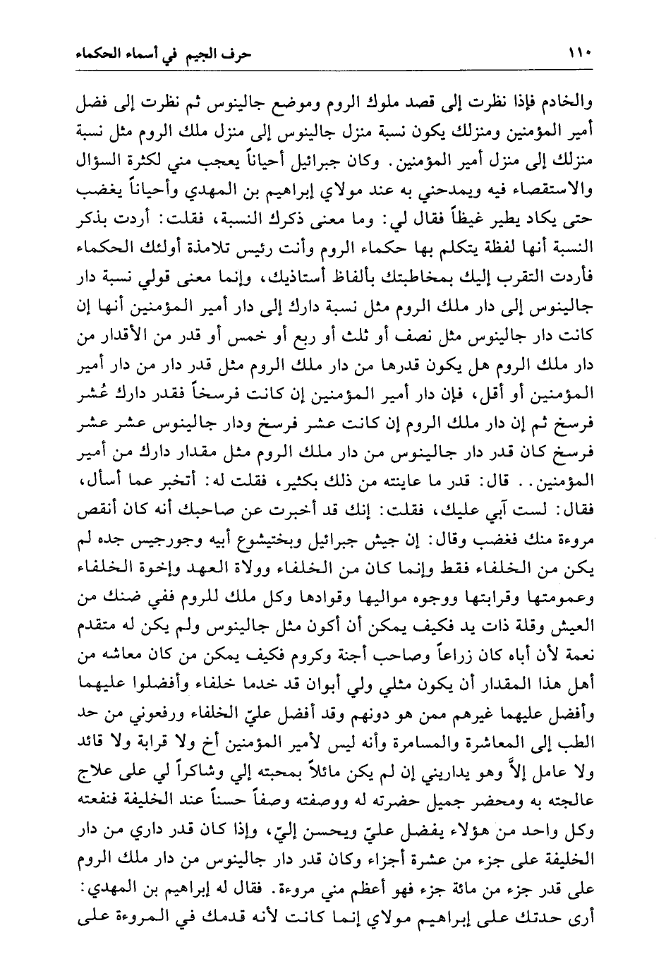 والخادم فإذا نظرت إلي قصد ملوك الروم وموضع جالينوس ثُمَّ نظرت إِلَى فضل أمير المؤمنين ومنزلك يكون نسبة منزل جالينوس إِلَى منزل ملك الروم مثل نسبة منزلك إِلَى منزل أمير المؤمنين وكان جبرائيل أحياناً يعجب مني لكثرة السؤال والاستقصاء فِيهِ ويمدحني بِهِ عند مولاي إبراهيم بن المهدي وأحياناً يغضب حَتَّى يكاد يطير غيظاً فقال لي وَمَا معنى ذكرك النسبة فقلت أردت بذكر النسبة أنها لفظة يتكلم بِهَا حكماء الروم وأنت رئيس تلامذة أولئك الحكماء فأردت التقرب إِلَيْكَ بمخاطبتك بألفاظ أستاذيك