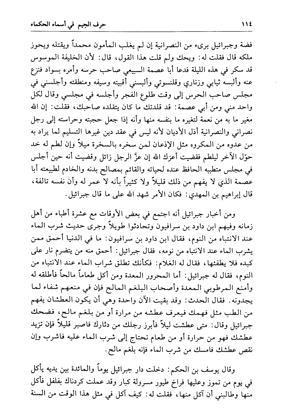 ومن أخبار جبرائيل أنه اجتمع فِي بعض الأوقات مع عشرة أطباء من أهل زمانه وفيهم ابن داوود بن سرافيون وتحادثوا طويلاً وجرى حديث شرب الماء عند الأنبياء من النوم فقال ابن داوود بن سرافيون مَا فِي الدنيا أحمق ممن يشرب الماء عند الانتباه من نومه فقال جبرائيل أحمق منه من يتضرم نار عَلَى كبده فلا يطفئها فقال لَهُ الغلام فكأنك تطلق شرب الماء عند الانتباه من النوم فقال لَهُ جبرائيل أما المحرور المعدة ومن أكل طعاماً مالحاً فأطلقه لَهُ وأمنع المرطوبي المعدة وأصحاب البلغم المالح فإن فِي منعهم شفاء لما يجدونه فقال الحدث وَقَدْ بقيت الآن واحدة وعي أن يكون العطشان يفهم من الطب مثل فهمك فيعرف عطشه من مرارة أَوْ من بلغم مالح فضحك جبرائيل وقال متى عطشت ليلاً فأبرز رجلك من دثارك فاصبر قليلاً فإن تزيد عطشك فهو من حرارة أَوْ من طعام تحتاج إِلَى شرب الماء عَلَيْهِ فاشرب وإن نقص عطشك فأمسك من شرب الماء فإنه بلغم مالح.