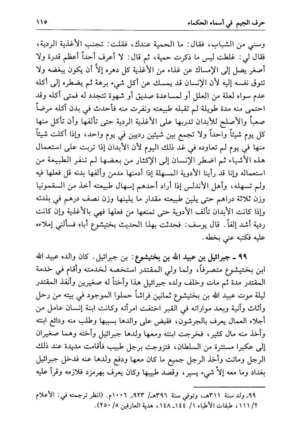 وسني من الشباب فقال مَا الحمية عندك فقلت تجنب الأغذية الردية فقال لي غلطت لَيْسَ مَا ذكرت حمية ثُمَّ قال لا أعرف أحداً أعظم قدرة ولا أصغر يصل إِلَى الإمساك عن غذاء من الأغذية كل دهره إِلاَّ أن يكون ببغضه ولا تتوق نفسه إِلَيْهِ لأن الإنسان قَدْ يمسك عن أكل شيء برهة ثُمَّ يضطره إِلَى أكله عدم سواء لعلة من العلل أَوْ لمساعدة صديق أَوْ شهوة تتجدد لَهُ فمتى أكله وَقَدْ احتمى منه مدة طويلة لَمْ تقبله طبيعته ونفرت منه فأحدث فِي بدن آكله مرضاً صعباً والأصلح للأبدان تدربها عَلَى الأغذية الردية حَتَّى تألفها وأن تأكل منها كل يوم شيئاً واحداً ولا تجمع بَيْنَ شيئين رديين فِي يوم واحد وإذا أكلت شيئاً منها فِي يوم لَمْ تعاوده فِي غد ذَلِكَ اليوم لأن الأبدان إذَا تربت عَلَى استعمال هَذِهِ الأشياء ثُمَّ اضطر الإنسان إِلَى الإكثار من بعضها لَمْ تنفر من استعماله وإنا قَدْ رأينا الأدوية المسهلة إذَا أدمتها مدمن وألفها بدنه فإن فعلها فِيهِ وَلَمْ تسهله وأهل الأندلس إذَا أراد أحدهم إسهال طبيعته أخذ من السقمونيا وزن ثلاثة دراهم حَتَّى يلين طبيعته مقدار مَا يلينها وزن نصف درهم فِي بلدته وإذا كَانَتْ الأبدان تألف الأدوية حَتَّى تمنعها من فعلها فهي بالأغذية وغن كَانَتْ ردية أشد إلفاً قال يوسف فحدثت بهذا الحديث بختيشوع أباه فسألني إملاءه عَلَيْهِ فكتبه عني بخطه.
