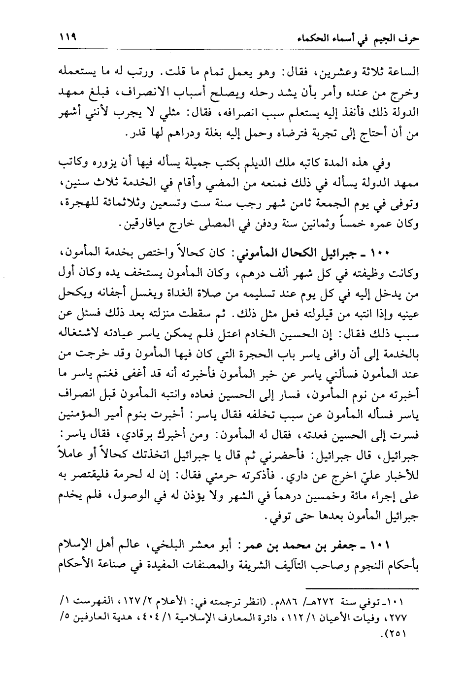 جبرائيل الكحال المأموني كَانَ كحالاً واختص بخدمة المأمون وَكَانَتْ وظيفته فِي كل شهر ألف درهم وَكَانَ المأمون يستخف يده وَكَانَ أول من يدخل إِلَيْهِ فِي كل يوم عند تسليمه من صلاة الغداة ويغسل أجفانه ويكحل عينيه وإذا انتبه من قيلولته فعل مذل ذَلِكَ ثُمَّ سقطن منزلته بعد ذَلِكَ فسئل عن سبب ذَلِكَ فقيل أن الحسين الخادم اعتل فلم يكن ياسر عيادته لاشتغاله بالخدمة إِلَى أن وافى ياسر باب الحجرة الَّتِي كَانَ فِيهَا المأمون وَقَدْ خرجت من عند المأمون فسألني ياسر عن خبر المأمون فأخبرته أنه قَدْ أغفى فغنم ياسر مَا أخبرته من نوم المأمون فسار إِلَى الحسين فعاده وانتبه المأمون قبل انصراف ياسر فسأله المأمون عن سبب نخلفه فقال ياسر أخبرت بنوم أمير المؤمنين فسرت إِلَى الحسين فعدته فقال لَهُ المأمون زمن أخبرك برقادي فقال ياسر جبرائيل قال جبرائيل فأحضرني ثُمَّ قال يَا جبرائيل اتخذتك كحالاً أَوْ عاملاً للأخبار عليّ أخرج عن داري فأذكرته حرمتي فقال أن لَهُ حرمة فليقتصر بِهِ عَلَى إجراء مائة وخمسين درهماً فِي الشهر ولا يؤذن لَهُ فِي الوصول فلم يخدم جبرائيل المأمون بعدها حَتَّى توفي.