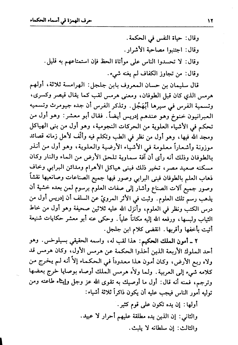 وقال حياة النفس فِي الحكمة. وقال اجتنبوا مصاحبة الأشرار. وقال لا تحسدوا الناس عَلَى مواتاة الخط فإن استمتاعهم بِهِ قليل. وقال من تجاوز الكفاف لَمْ يغنه شيء. قال سليمان بن حسان المعروف بابن جلجل الهرامسة ثلاثة أولهم هرمس الَّذِي كَانَ قبل الطوفان ومعني هرمس لقي كما يقال قيصر وكسرى وتسميه الفرس فِي سيرها ابُهَجُل وتذكر الفرس إِن وجد جيومرت وتسميه العبرانيون خنوخ وهو عندهم إدريس أيضاً قال أبو معشر وهو أول من تحكم فِي الأشياء العلوية من الحركات النجومية وهو أول من بنى الهياكل ومجد الله فِيهَا وهو أول من نظر فِي الطب وتكلم فِيهِ وألف لأهل زمانه قصائد موزونة وأشعاراً معلومة فِي الأشياء الأرضية والعلوية وهو أول من أنذر بالطوفان وذلك أنه رأى أن آفة سماوية تلحق الأرض من الماء والنار وَكَانَ مسكنه صعيد مصر تخير ذَلِكَ فبنى هياكل الأهرام ومدائن البرابي وخاف ذهاب العلم بالطوفان فبنى البرابي وصور فِيهَا جميع الصناعات وصانعيها نقشاً وصور جميع آلات الصناع وأشار إِلَى صفات العلوم برسوم لمن بعده خشية أن يذهب رسم تِلْكَ العلوم وثبت فِي الأثر المرويّ عن السلف أن إدريس أول من درس الكتب ونظر فِي العلوم وأنزل الله عَلَيْهِ ثلاثين صحيفة وهو أول من خاط الثياب ولبسها ورفعه الله إِلَيْهِ مكاناً علياً وحكى عنه أبو معشر حكايات شنيعة أتيت بأخفها وأقربها لتقضي كلام ابن جلجل.