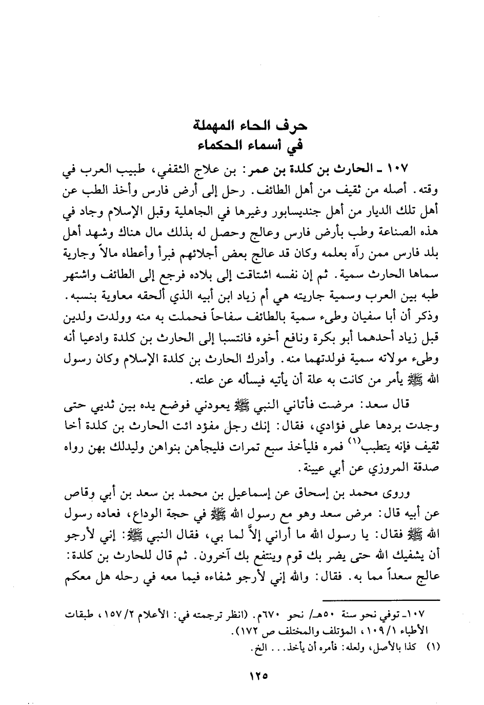 الحارث بن كلدة بن عمر بن علاج الثقفي طبيب العرب فِي وقته أصله من ثقيف من أهل الطائف رحل إِلَى أرض فارس وأخذ الطب عن أهل تِلْكَ الديار من أهل جند يسابور وغيرها فِي الجاهلية وقبل الإسلام وجاد فِي هَذِهِ الصناعة وطب بأرض فارس وعالج وحصل لَهُ بذلك مال هناك وشهد أهل بلد فارس ممن رآه بعلمه وَكَانَ قَدْ عالج بعض أجلائهم فبرأ وأعطاه مالاً وجارية سماها الحارث سمية ثُمَّ أن نفسه اشتاقت لبى بلاده فرجع إِلَى الطائف واشتهر طبه بَيْنَ العرب وسمية جاريته هي أم زياد بن أبيه الَّذِي ألحقه معاوية بنسبه وذكر أن أبا سفيان وطئ سمية بالطائف سفاحاً فحملت بِهِ منه وولدت ولدين قبل زياد أحدهما أبو بكرة ونافع أخوه فانتسبا إِلَى الحارث بن كلدة وادعيا أنه وطئ مولاته سمية فولدتهما منه وأدرك الحارث بن كلدة الإسلام وَكَانَ رسول الله صلى الله عليه وسلم يأمر من كَانَتْ بِهِ علة أن يأتيه فيسأله عن علته.