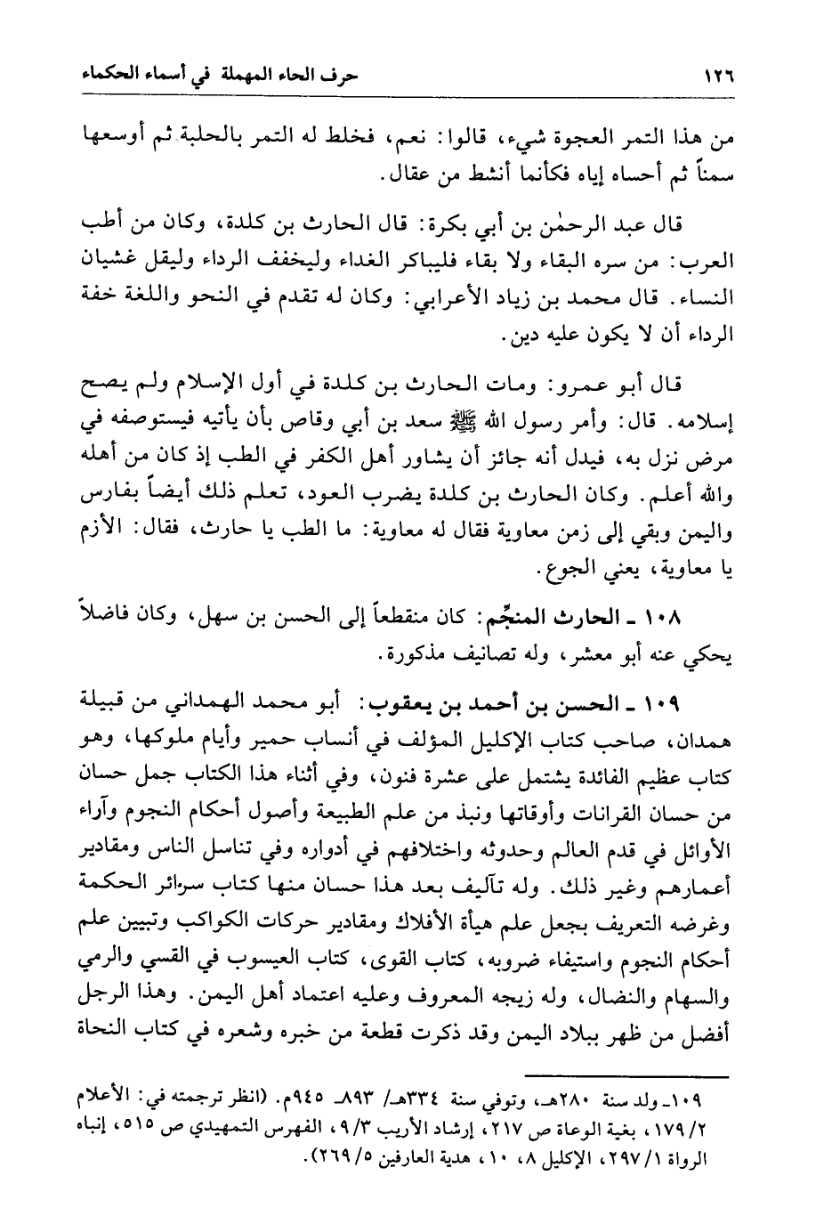 الحسن بن أحمد بن يعقوب أبو محمد الهمداني من قبيلة همدان صاحب كتاب الإكليل المؤلف فِي أنساب حمير وأيام ملوكها وهو كتاب عظيم الفائدة يشتمل عَلَى عشرة فنون وَفِي أثناء هَذَا الكتاب جمل حسان من حسان القرانات وأوقاتها ونبذ من علم الطبيعة وأصول أحكام النجوم وآراء الأوائل فِي قدم العالم وحدوثه واختلافهم فِي أدواره وَفِي تناسل الناس ومقادير أعمارهم وغير ذَلِكَ وَلَهُ تآليف بعد هَذَا حسان منها. كتاب سرائر الحكمة وغرضه التعريف بجمل هيئة الأفلاك ومقادير حركات الكواكب وتبين علم أحكام النجوم واستيفاء ضروبه. كتاب القوى. كتاب اليعسوب فِي القسي والرمي والسهام والنضال وَلَهُ زيجه المعروف وعليه اعتماد أهل اليمن وهذا الرجل أفضل من ظهر ببلاد اليمن وَقَدْ ذكرت قطعة من خبره وشعره فِي كتاب النحاة