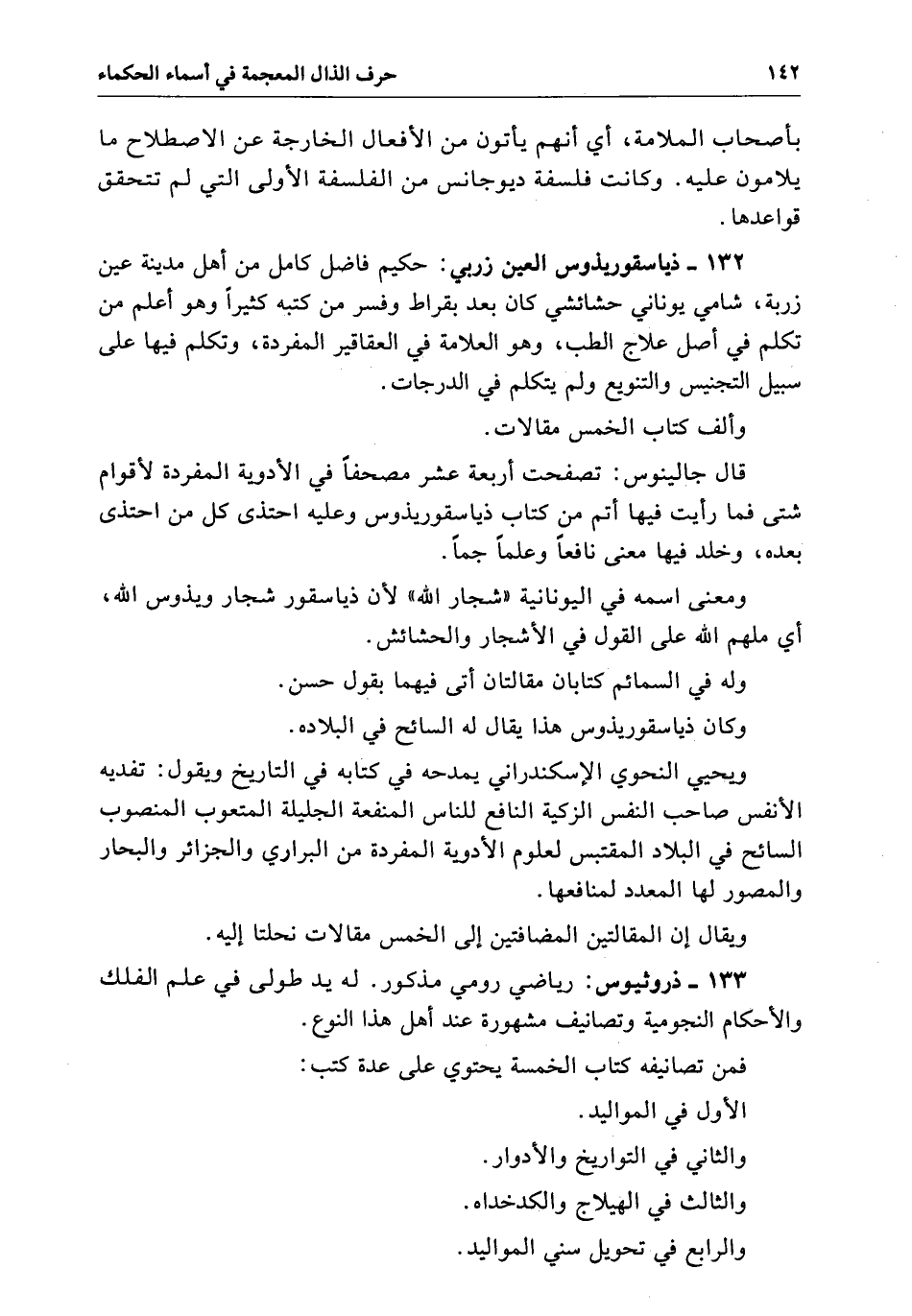 ذياسقوريذوس العين زربي حكيم فاضل كامل من أهل مدينة عين زربة شامي يوناني حشائشتي كَانَ بعد بقراط وفسر من كتبه كثيراً وهو أعلم من تكلم فِي أصل علاج الطب وهو العلامة فِي العقاقير المفردة وتكلم فِيهَا عَلَى سبيل التجنيس والتنويع وَلَمْ يتكلم فِي الدرجات وألف. كتاب الخمس مقالات قال جالينوس تصفحت أربعة عشر مصحفاً فِي الأدوية المفردة لأقوام شتى فما رأيت فِيهَا أتم من كتاب ذياسقوريذوس وعليه احتذى كل من احتذى بعده وخلد فِيهَا منّي نافعاً وعلماً جماً.