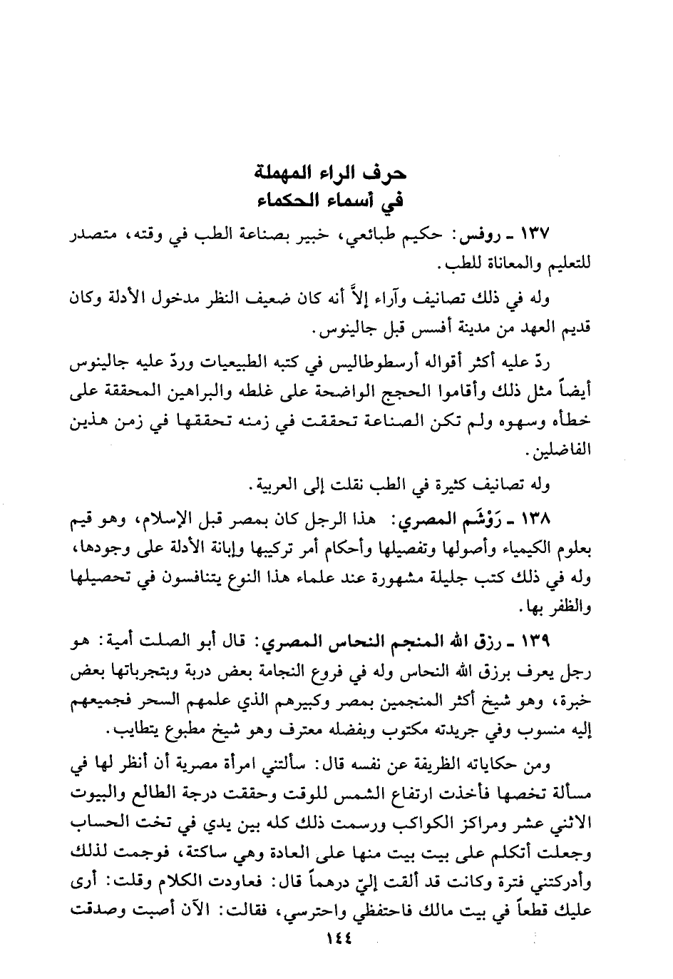 روفس حكيم طبائعي خبير بصناعة الطب فِي وقته متصدر للتعليم والمعاناة للطب وَلَهُ فِي ذَلِكَ تصانيف وآراء إِلاَّ أنه كَانَ ضعيف النظر مدخول الأدلة وَكَانَ قديم العهد من مدينة أفسس قبل جالينوس ردّ عَلَيْهِ أكثر أقواله أرسطوطاليس فِي كتبه الطبيعيات وردّ عَلَيْهِ جالينوس أيضاً مثل ذَلِكَ وأقاموا الحجج الواضحة عَلَى غلطه والبراهين المحققة عَلَى خطأه وسهوه وَلَمْ تكن الصناعة تحققت فِي زمنه تحققها فِي زمن هذين الفاضلين وَلَهُ تصانيف كثيرة فِي الطب نقلت إِلَى العربية.