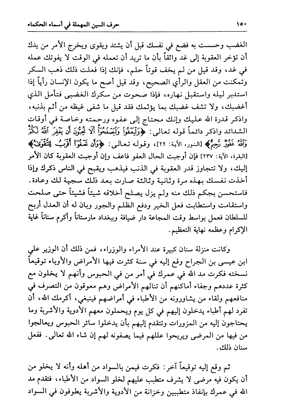 الغضب وحسست بِهِ فضع فِي نفسك قبل أن يشتد ويقوى ويخرج الأمر من يدك أن تؤخر العقوبة إِلَى غد واثقاً بأم مَا تريد أن تعمله فِي الوقت لا يفوتك عمله فِي غد وَقَدْ قيل من لَمْ يخف فوتاً حلم فإنك إِذَا فعلت ذَلِكَ ذهب السكر وتمكنت من العقل والرأي الصحيح وَقَدْ قيل أصح مَا يكون الإنسان رأياً إِذَا استدبر ليله واستقبل نهاره فإذا صحوت من سكرك الغضبى فتأمل الَّذِي أغضبك ولا تشف غضبك بما يؤتمك فقد قيل مَا شفى غيظه من إثم بذنبه واذكر قدرة الله عَلَيْكَ وإنك محتاج إِلَى عفوه ورحمته وخاصة فِي أوقات الشدائد واذكر دائماً قوله تعالى وليعفوا وليصفحوا ألا تحبون أن يغفر الله لكم والله غفور رحيم وقوله تعالى وإن تعفوا أقرب للتقوى فإن أوجبت الحال العفو فاعف وإن أوجبت العقوبة كَانَ الأمر إِلَيْكَ ولا تتجاوز قدر العقوبة فِي الذنب فيذهب ويقبح فِي الناس ذكرك وإذا أخذت نفسك بهذه مرة وثانية وثالثة صارت بعد ذَلِكَ سجية لَكَ وعادة فاستحسن بحكم ذَلِكَ منه وَلَمْ يزل يصلح أخلاقه شيئاً فشيئاً حَتَّى صلحت واستقامت واستطابت فعل الخير ودفع الظلم والجور وبأن لَهُ أن العدل أربح للسلطان فعمل بواسط وقت المجاعة دار ضيافة وببغداد مارستانا وأكرم سناناً غاية الإكرام وعظمة نهاية التعظيم.
