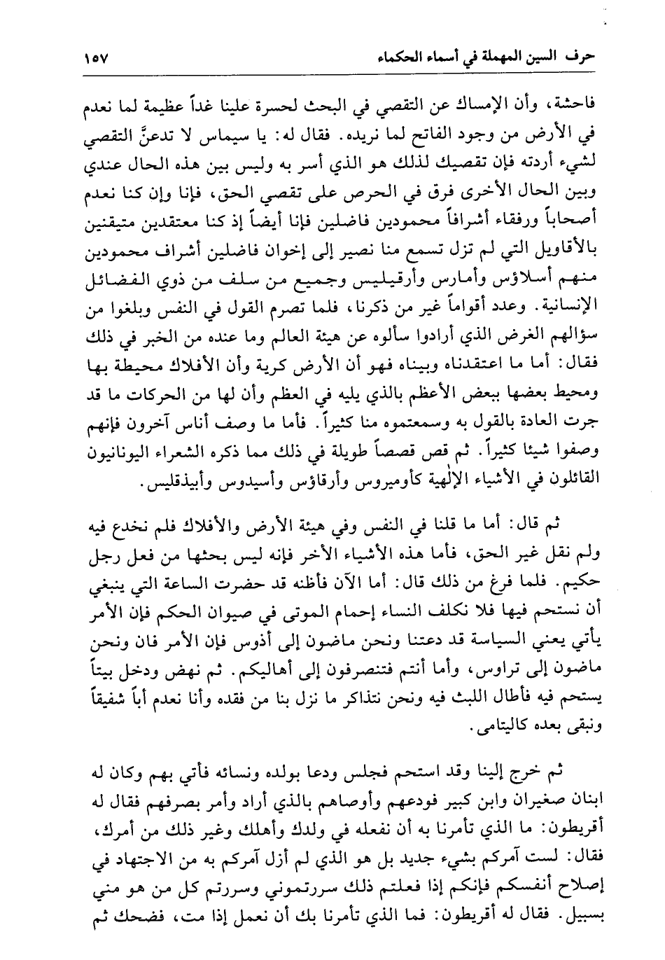 فاحشة وأن الإمساك عن التقصي فِي البحث لحسرة علينا غداً عظيمة لما نعدم فِي الأرض من وجود الفاتح لما تريده فقال لَهُ يَا سيماس لا تدعنَّ التقصي لشيء أردته فإن تقصيك لذلك هو الَّذِي أسر بِهِ وَلَيْسَ بَيْنَ هَذِهِ الحال عندي وبين الحال الأخرى فرق فِي الحرص عَلَى تقصي الحق فإنا وإن كنا نعدم أصحاباً ورفقاء إشرافاً محمودين فاضلين فإنا أيضاً إذ كنا معتقدين متيقنين بالأقاويل الَّتِي لَمْ تزل منا نصير إِلَى إخوان فاضلين إشراف محمودين منهم اسلاؤس واملوس وارقيليس وجميع من سلف من ذوي الفضائل الإنسانية وعدد أقواماً غير من ذكرنا فلما تصرم القول فِي السفس وبلغوا من سؤالهم الغرض الَّذِي أرادوا سألوه عن هيئة العالم وَمَا عنده من الخبر فِي ذَلِكَ فقال أما مَا اعتقدناه وبيناه فهو أن الأرض كروية وأن الأفلاك محيطة بِهَا ومحيط بعضها ببعض الأعظم بالذي يليه فِي العظم وأن لَهَا من الحركات مَا قَدْ جرت العادة بالقول بِهِ وسمعتموه منا كثيراً فأما مَا وصف أناس آخرون فإنهم وصفوا شيئاً كثيراً ثُمَّ قص قصصاً طويلة فِي ذَلِكَ مما ذكره الشعراء اليونانيون القائلون فِي الأشياء الإلهية كاوميروس وارقاؤس وأسيدوس وابيذقليس ثُمَّ قال أما مَا قلنا فِي النفس وَفِي هيئة الأرض والأفلاك فلم نخدع فِيهِ وَلَمْ نقل غير الحق فأما هَذِهِ الأشياء الأخر فإنه لَيْسَ بحثها من فعل رجل حكيم فلما فرغ من ذَلِكَ قال أما الآن فأظنه قَدْ حضرت الساعة الَّتِي ينبغي أن نستجم فِيهَا فلا نكلف النساء إحمام الموتى فِي صيوان الحكم فإن الأمر يأتي يعني السياسة قَدْ دعتنا ونحن ماضون إِلَى اذوس فإن الأمر فانٍ ونحن ماضون إِلَى تراوس وأما أنتم فتنصرفون إِلَى أهاليكم ثُمَّ نهض ودخل بيتاً يستحم فِيهِ فأطال اللبث فِيهِ ونحن نتذاكر مَا نزل بِنَا من فقده وإنا نعدم أباً شفيقاً وتبقى بعده كاليتامى ثُمَّ خرج إلينا وَقَدْ استحم فجلس ودعا بولده ونسائه فأتى بهم وَكَانَ لَهُ ابنان صغيران وابن كبير فودعهم وأوصاهم بالذي أراد وأمر بصرفهم فقال لَهُ قريطون مَا الَّذِي تأمرنا بِهِ أن نفعله فِي ولدك وأهلك وغير ذَلِكَ من أمرك فقلت لست آمركم بشيء جديد بل هو الَّذِي لَمْ أزل آمركم بِهِ من الاجتهاد فِي إصلاح أنفسكم فإنكم إِذَا فعلتم ذَلِكَ سررتموني وسررتم كل من هو مني بسبيل فقال لَهُ اقريطون فما الَّذِي تأمرنا بك أن نعمل إِذَا مت فضحك ثُمَّ