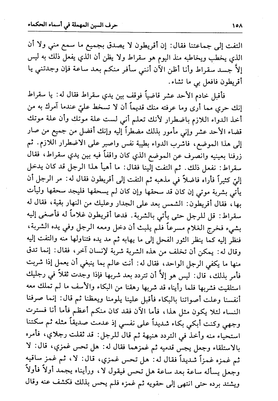 لَهُ يَا سقراط إنك حري معها أرى وَمَا عرفته منك قديماً أن لا تسخط عليّ عندما آمرك بِهِ من أخذ الدواء اللازم باضطرار لأنك تعلم أتي لست علة موتك وأن علة موتك قضاء الحد عشر وإني مأمور بذلك مضطر إِلَيْهِ وإنك أفضل من جميع من صار إِلَى هَذَا الموضع فاشرب الدواء بطيبة نفس واصبر عَلَى الاضطرار اللازم ثُمَّ رزقنا بعينيه وانصرف عن الموضع الَّذِي كَانَ واقفاً فِيهِ بَيْنَ يدي سقراط فقال سقراط نفعل ذَلِكَ ثُمَّ التفت إلينا فقال مَا أهيأ هَذَا الرجل قَدْ كَانَ يدخل إِليّ كثيراً فأراه فاضلاً فِي مذهبه ثُمَّ التفت إِلَى اقريطون فقال لَهُ مر الرجل أن يأتي بشربة موتى غم كَانَ قَدْ سحقها وإن كَانَ لَمْ يسحقها فليجد سحقها وليأت بِهَا فقال اقريطون الشمس بعد عَلَى الجدار وعليك من النهار بقية فقال لَهُ سقراط قل للرجل حَتَّى يأتي بالشربة فدعا اقريطون غلاماً لَهُ فأصغى إِلَيْهِ بشيء فخرج الغلام مسرعاً فلم يلبث أن دخل ومعه الرجل وَفِي يده الشربة فنظر إِلَيْهِ كما ينظر الثور الفحل إِلَى مَا يهابه ثُمَّ مد يده فتناولها والتفت إِلَيْهِ وقال لَهُ يمكن أن تخلف من هَذِهِ الشربة شربة لإنسان آخر فقال إنما تدق منها مَا يطفي الرجل الواحد فقال لَهُ أنت عالم بما ينبغي أن يعمل إِذَا شربت فأمر بذلك قال لَيْسَ هو إِلاَّ أن تتردد بعد شربها فإذا وجدت ثقلً فِي رجليك استلقيت فشربها فلما رأيناه قَدْ شربها رهقنا من البكاء والأسف مَا لَمْ نملك معه أنفسنا وعلت أصواتنا بالبكاء فأقبل علينا يلومنا ويعظنا ثُمَّ قال إنما صرفنا النساء لئلا يكون مثل هَذَا فأما الآن فقد كَانَ منكم أعظم فأما أنا فسترت وجهي وكنت أبكي بكاء شديداً عَلَى نفسي إذ عدمت صديقاً مثله ثُمَّ سكتنا استحياء منه وأخذ فِي التردد هنيهة ثُمَّ قال للرجل قَدْ ثقلت رجلاي فأمره بالاستلقاء وجعل يجس قدميه ثُمَّ غمرهما فقال لَهُ هل تحس غمزي قال لا ثُمَّ غمزه غمزاً شديداً فقال لَهُ هل تحس غمزي قال لا ثُمَّ غمز ساقيه وجعل يسأله ساعة بعد ساعة هل تحس فيقول لا ورأيناه يجمد أولاً فأولاً ويشتد برده حَتَّى انتهى إِلَى حقوبه ثُمَّ غمزه فلم يحس بذلك فكشف عنه وقال لَنَا إِذَا انتهى هَذَا البرد إِلَى قلبه قضى عَلَيْهِ ثُمَّ قال سقراط لقريطون اسفلابيوس عندما ديك فأعطوه إياه وعجلوه فقال لَهُ اقريطون نفعل ذَلِكَ وإن كنت تريد شيئاً آخر فقل فلم يجبه وشخص ببصره فأطبق قريطون عينيه وشد لحيته فهذا خير سقراط صاحبنا الَّذِي لا نعلم أحداً فِي دهرنا من اليونانيين كَانَ أفضل منه فقال لَهُ خقراطيس فمن كَانَ حاضراً فقال جماعة كثيرة من أصحاب سقراطيس فقال هل أكان أفلاطون حاضركم قال لا لأنه كَانَ مريضاً لا يقدر عَلَى الحضور. َهُ يَا سقراط إنك حري معها أرى وَمَا عرفته منك قديماً أن لا تسخط عليّ عندما آمرك بِهِ من أخذ الدواء اللازم باضطرار لأنك تعلم أتي لست علة موتك وأن علة موتك قضاء الحد عشر وإني مأمور بذلك مضطر إِلَيْهِ وإنك أفضل من جميع من صار إِلَى هَذَا الموضع فاشرب الدواء بطيبة نفس واصبر عَلَى الاضطرار اللازم ثُمَّ رزقنا بعينيه وانصرف عن الموضع الَّذِي كَانَ واقفاً فِيهِ بَيْنَ يدي سقراط فقال سقراط نفعل ذَلِكَ ثُمَّ التفت إلينا فقال مَا أهيأ هَذَا الرجل قَدْ كَانَ يدخل إِليّ كثيراً فأراه فاضلاً فِي مذهبه ثُمَّ التفت إِلَى اقريطون فقال لَهُ مر الرجل أن يأتي بشربة موتى غم كَانَ قَدْ سحقها وإن كَانَ لَمْ يسحقها فليجد سحقها وليأت بِهَا فقال اقريطون الشمس بعد عَلَى الجدار وعليك من النهار بقية فقال لَهُ سقراط قل للرجل حَتَّى يأتي بالشربة فدعا اقريطون غلاماً لَهُ فأصغى إِلَيْهِ بشيء فخرج الغلام مسرعاً فلم يلبث أن دخل ومعه الرجل وَفِي يده الشربة فنظر إِلَيْهِ كما ينظر الثور الفحل إِلَى مَا يهابه ثُمَّ مد يده فتناولها والتفت إِلَيْهِ وقال لَهُ يمكن أن تخلف من هَذِهِ الشربة شربة لإنسان آخر فقال إنما تدق منها مَا يطفي الرجل الواحد فقال لَهُ أنت عالم بما ينبغي أن يعمل إِذَا شر