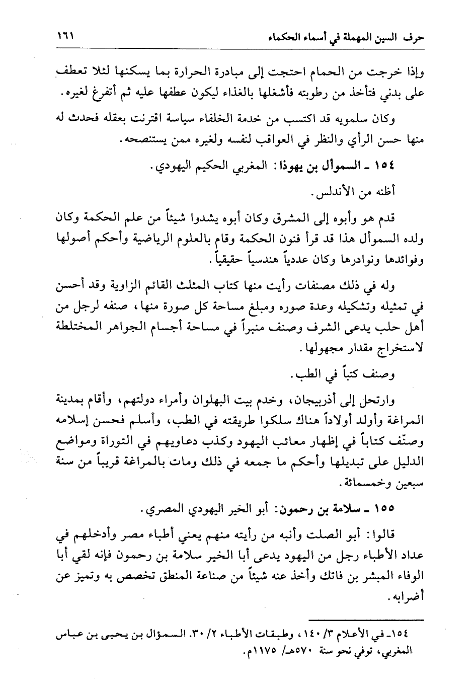 السموأل بن يهوذا المغربي الحكيم اليهودي أظنه من الأندلس قدم هو وأبوه إِلَى المشرق وَكَانَ أبوه يشدو شدواً شيئاً من علم الحكمة وَكَانَ ولده السموأل هَذَا قَدْ قرأ فنون الحكمة وقام بالعلوم الرياضية وأحكم أصولها وفوائدها ونوادرها وَكَانَ عددياً هندسياً حقيقياً وَلَهُ فِي ذَلِكَ مصنفات رأيت منها كتاب المثلث القائم الزاوية وَقَدْ أحسن فِي تمثيله وتشكيله وعدة صوره ومبلغ مساحة كل صورة منها صنفه لرجل من أهل حلب يدعي الرف وصنف منبراً فِي مساحة أجسام الجواهر المختلطة لاستخراج مقدار مجهولها وصنف كتباً فِي الطب.