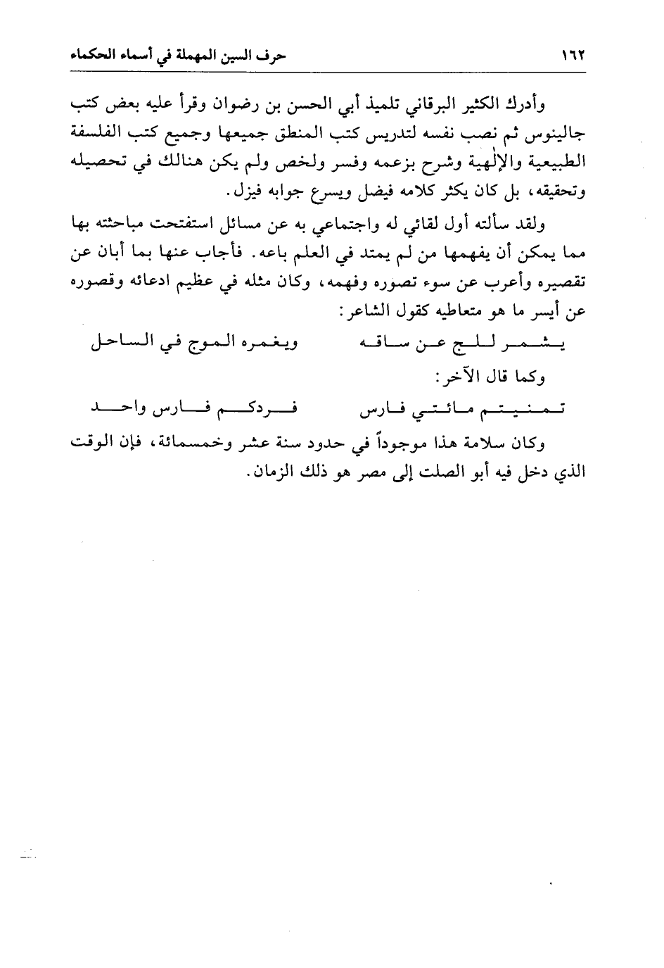 وأدرك الكثير البرقاني تلميذ أبي الحسن بن رضوان وقرأ عَلَيْهِ بعض كتب جالينوس ثُمَّ نصب نفسه لتدريس كتب المنطق جميعها وجميع كتب الفلسفة الطبيعية والإلهية وشرح بزعمه وفسر ولخص وَلَمْ يكن هنالك فِي تحصيله وتحقيقه بل كَانَ يكثر كلامه فيضل ويسرع فِي جوابه فيزل ولقد سألته أول لقائي لَهُ واجتماعي بِهِ عن مسائل استفتحت مباحثته بِهَا مما يمكن أن يفهمها من لَمْ يمتد فِي العلم باعه فأجاب عنها بما أبان عن تقصيره وأعرب عن سوء تصوره وفهمه وَكَانَ مثله فِي عظيم ادعائه وقصوره عن أيسر مَا هو متعاطيه كقول الشاعر: