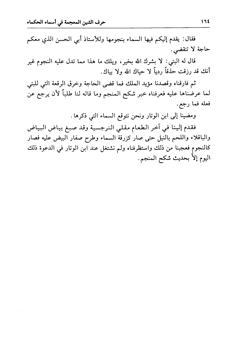 فقال يقدم إِلَيْكَم فِيهَا السماء بنجومها وللأستاذ أبي الحسن الَّذِي معكم حاجة لا تنقضي فقال لَهُ البتي لا بشرك الله بخير ويلك مَا هَذَا مما تدل عَلَيْهِ النجوم غير أنك قَدْ رزقت حذقاً ردياً لا حياك الله ولا بياك ثُمَّ فارقناه وقصدنا مؤيد الملك فما قضى الحاجة وخرق الرقعة الَّتِي للبتي لما عرضناها عَلَيْهِ فعرفناه خير شكح المنجم وَمَا قاله لَنَا طلباً لأن يرجع عن فعله فما رجع ومضينا إِلَى ابن الوتار ونحن نتوقع السماء الَّتِي ذكرها فقدم إلينا فِي آخر الطعام مقلي النرجسية وَقَدْ صبغ بياض البيض والباقلاء واللحم بالنيل حَتَّى صار كزرقة السماء وطرح صفار البيض عَلَيْهِ فصار كالنجوم فعجبنا من ذَلِكَ واستظرفناه وَلَمْ نشتغل عند ابن الوتار فِي الدعوة ذَلِكَ اليوم إِلاَّ بحديث شكح المنجم.