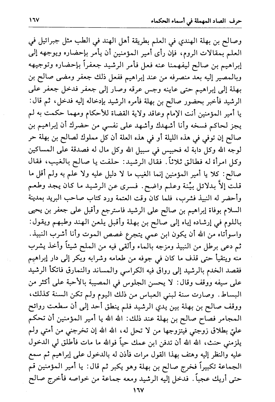وصال بن بهلة الهندي فِي العلم بطريقة أهل الهند فِي الطب مثل جبريل فِي العلم بمقالات الروم فإن رأى أمير المؤمنين أن يأمر بإحضاره ويوجهه إِلَى إبراهيم بن صالح ليفهمنا عنه فعل فأمر الرشيد جعفراً بإحضاره وتوجيهه وبالمصير إِلَيْهِ بعد منصرفه من عند إبراهيم ففعل ذَلِكَ ومضى صالح بن بهلة إِلَى إبراهيم حَتَّى عاينه وجس عرقه وصار إِلَى جعفر فدخل جعفر عَلَى الرشيد فأخبره بحضور صالح بن بهلة فأمره الرشيد بإدخاله إِلَيْهِ فدخل ثُمَّ قال يَا أمير المؤمنين أنت الإمام وعاقد ولاية القضاء للأحكام ومهما حكمت بِهِ لَمْ يجز لحاكم فسخه وأنا أشهدك وأشهد عَلَى نفسي من حضرك أن إبراهيم بن صالح إِن توفي فِي هَذِهِ الليلة أَوْ فِي هَذِهِ العلة ام كل مملوك لصالح بن بهلة حر لوجه الله وكل دابة لَهُ فحبيس فِي سبيل الله وكل مال لَهُ فصدقة عَلَى المساكين وكل امرأة لَهُ فطالق ثلاثاً فقال الرشيد حلفت يَا صالح بالغيب فقال صالح كلا يَا أمير المؤمنين إنما الغيب مَا لا دليل عَلَيْهِ ولا علم بِهِ وَلَمْ أقل مَا قلت إِلاَّ بدلائل بينة وعلم واضح فسرى عن الرشيد مَا كَانَ يجد وطعم وأحضر لَهُ النبي فشرب فلما كَانَ وقت العتمة ورد كتاب صاحب البريد بمدينة السلام بوفاة إبراهيم بن صالح علي الرشيد فاسترجع وأقبل عَلَى جعفر بن يحيى باللوم فِي إرشاده إياه إِلَى صالح بن بهلة وأقبل يلعن الهند وطبهم ويقول واسوأتا من الله أن يكون ابن عمي يتجرع غصص الموت وأنا أشرب النبيذ ومزجه بالماء وألقى فِيهِ من الملح شيئاً وأخذ يشرب منه ويتقيأ حَتَّى قذف مَا كَانَ فِي جوفه من طعامه وشرابه وبكر إِلَى دار إبراهيم فقصد الخدم بالرشيد إِلَى رواق فِيهِ الركاسي والمساند والنمارق فاتكأ الرشيد عَلَى سيفه ووقف وقال لا يحسن الجلوس فِي المصيبة بالأحبة عَلَى أكثر من البساط وصارة سنة لبني العباس من ذَلِكَ وَلَمْ تكن السنة كذلك ووقف صالح بن بهلة بَيْنَ يدي الرشيد فلم ينطق أحد إِلَى أن سطعت روائح المجامر فصاح صالح بن بهلة عند ذَلِكَ الله الله يَا أمير المؤمنين أن تحكم عليّ بطلاق زوجتي فيتزوجها من لا تحل لَهُ الله الله أن تخرجني من اسمتي وَلَمْ يلزمني حنث الله الله أن تدفن ابن عمك حياً فوالله مَا مات فأطلق لي الدخول عَلَيْهِ وانتظر إِلَيْهِ وهتف بهذا القول مرات فأذن لَهُ بالدخول عَلَى إبراهيم ثُمَّ سمع الجماعة تكبيراً فخرج صالح بن بهلة وهو يكبر ثُمَّ قال يَا أمير المؤمنين قم حَتَّى أريك عجباً فدخل إِلَيْهِ الرشيد ومعه جماعة من خواصه فأخرج صالح