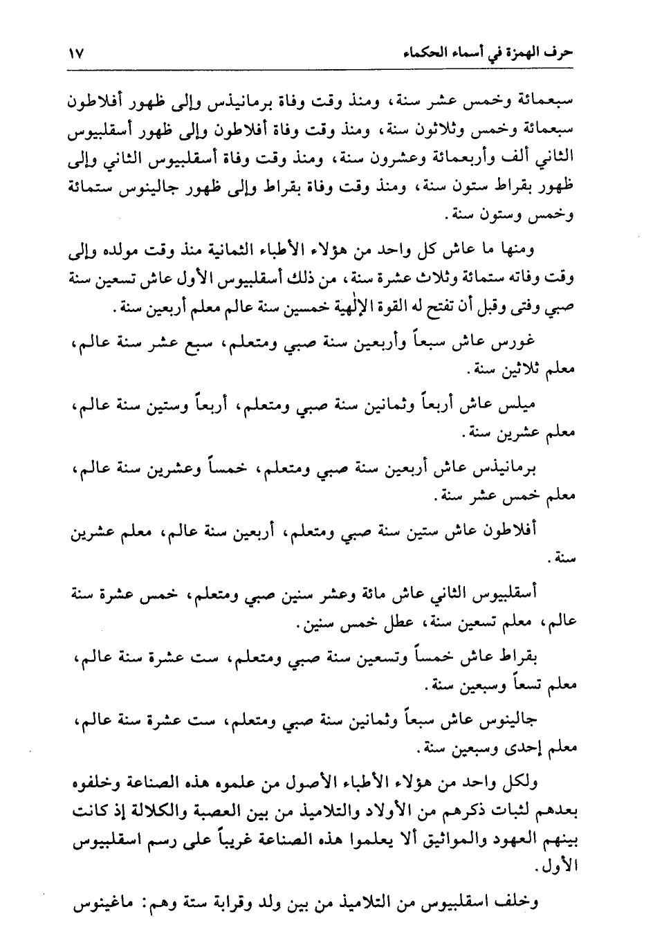سبعمائة وخمس عشر سنة ومنذ وقت وفاة برمانيذس وإلى ظهور أفلاطون سبعمائة وخمس وثلاثون سنة ومنذ وقت وفاة أفلاطون وإلى ظهور إسقلبيوس الثاني ألف وأربعمائة وعشرون سنة ومنذ وقت وفاة إسقلبيوس الثاني وإلى ظهور بقراط ستون سنة ومنذ وقت وفاة بقراط وإلى ظهور جالينوس ستمائة وخمس وستون سنة ومنها مَا عاش كل واحد من هؤلاء الأطباء الثمانية منذ وقت مولده وإلى وقت وفاته ستمائة وثلاث عشرة سنة من ذَلِكَ إسقلبيوس الأول عاش تسعين سنة صبي وفتى وقبل أن تفتح لَهُ القوة الإلهية خمسين سنة عالم معلم ثلاثين سنة ميلس عاش أربعاً وثمانين سنة صبي ومتعلم أربعاً وستين سنة عالم معلم عشرين سنة برمانيذس عاش أربعين سنة صبي ومتعلم خمساً وعشرين سنة عالم معلم خمس عشرة سنة أفلاطون عاش ستين سنة صبي ومتعلم أربعين سنة عالم معلم عشرين سنة إسقلبيوس الثاني عاش مائة وعشر سنين صبي ومتعلم خمس عشرة سنة عالم متعلم تسعين سنة عطل خمس سنين بقراط عاش خمساً وتسعين سنة صبي ومتعلم ست عشرة سنة عالم معلم تسعاً وسبعين سنة جالينوس عاش سبعاً وثمانين سنة صبي ومتعلم ست عشرة سنة عالم معلم إحدى وسبعين سنة ولكل واحد من هؤلاء الأطباء الأصول من علموه هَذِهِ الصناعة وخلفوه بعدهم لثبات ذكرهم من الأولاد والتلاميذ من بين العصبة والكلالة إذ كَانَتْ بينهم العهود والمواثيق ألا يعلموا هَذِهِ الصناعة غريباً عَلَى رسم إسقلبيوس الأول وخلف إسقلبيوس من التلاميذ من بين ولد وقرابة ستة وهم ماغينوس