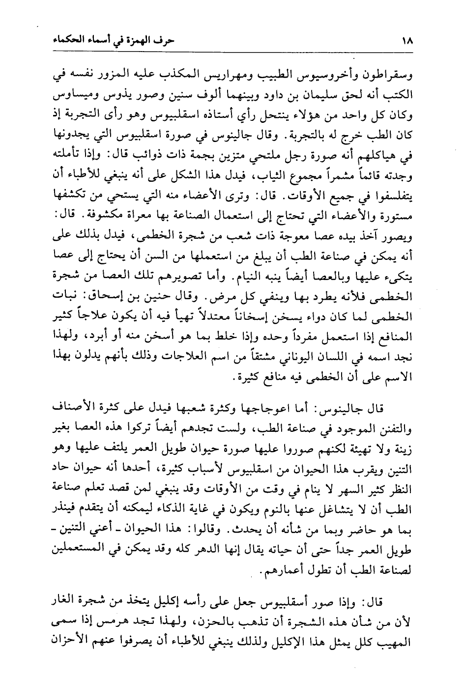 والأعضاء الَّتِي تحتاج إِلَى استعمال الصناعة بِهَا معراة مكشوفة قال ويصور آخذ بيده عصا معوجة ذات شعب من شجرة الخطمى فيدل بذلك عَلَى أنه يمكن فِي صناعة الطب ان يبلغ من استعملها من السن أن يحتاج إِلَى عصا يتكئ عَلَيْهَا وبالعصا أيضاً ينبه النيام وأما تصويرهم تِلْكَ العصا من شجرة الخطمى فلأنه يطرد بِهَا وينفي كل مرض وقال حنين ابن إسحاق نبات الخطمى لما كَانَ دواه يسخن إسخاناً معتدلاً تهيأ فِيهِ أن يكون علاجاً كثير المنافع إنما إذَا استعمل مفرداً وحده وإذا خلط بما هو أسخن منه أَوْ أبرد ولهذا تجد اسمه فِي اللسان اليوناني مشتقاً من اسم العلاجات وذلك بأنهم يدلون بهذا الاسم عَلَى أن الخطمى فِيهِ منافع كثيرة قال جالينوس أما اعوجاجها وكثرة شعبها فيدل عَلَى كثرة الأصناف والتفنن الموجود فِي صناعة الطب ولست تجدهم أيضاً تركوا هَذِهِ العصا بغير زينة ولا تهيئة لكنهم صوروا عَلَيْهَا صورة حيوان طويل الشعر يلتف عَلَيْهَا وهو التنين ويقرب هَذَا الحيوان من إسقلبيوس لأسباب كثيرة أحدها أنه حيوان حاد النظر كثير السهر لا ينام فِي وقت من الأوقات وَقَدْ ينبغي لمن قصد تعلم صناعة الطب أن لا يتشاغل عنها بالنوم ويكون فِي غاية الذكاء ليمكنه أن يتقدم فينذر بما هو حاضر وبما من شأنه أن يحدث وقالوا هَذَا الحيوان أعني التنين طويل العمر جداً حَتَّى أن حياته يقال أنها الدهر كله وَقَدْ يمكن فِي المستعملين لصناعة الطب أن تطول أعمارهم قال وإذا صور إسقلبيوس جعل عَلَى رأسه إكليل يتخذ من شجرة الغار لأن من شأن هَذِهِ الشجرة أن تذهب بالحزن ولهذا تجد هرمس إذَا سمى المهيب كليل بمثل هَذَا الإكليل ولذلك ينبغي للأطباء أن يصرفوا عنهم الحزان لأن إسقلبيوس كلل بإكليل يذهب بالحزن ولأن الشجرة هَذِهِ أيضاً فِيهَا قوة تشفي الأمراض من ذَلِكَ أنك تجدها إذَا ألقيت فِي موضع هربت من ذَلِكَ الموضع الهوام وذوات السموم. لأعضاء الَّتِي تحتاج إِلَى استعمال الصناعة بِهَا معراة مكشوفة قال ويصور آخذ بيده عصا معوجة ذات شعب من شجرة الخطمى فيدل بذلك عَلَى أنه يمكن فِي صناعة الطب ان يبلغ من استعملها من السن أن يحتاج إِلَى عصا يتكئ عَلَيْهَا وبالعصا أيضاً ينبه النيام وأما تصويرهم تِلْكَ العصا من شجرة الخطمى فلأنه يطرد بِهَا وينفي كل مرض وقال حنين ابن إسحاق نبات الخطمى لما كَانَ دواه يسخن إسخاناً معتدلاً تهيأ فِيهِ أن يكون علاجاً كثير المنافع إنما إذَا استعمل مفرداً وحده وإذا خلط بما هو أسخن منه أَوْ أبرد ولهذا تجد اسمه فِي اللسان اليوناني مشتقاً من اسم العلاجات وذلك بأنهم يدلون بهذا الاسم عَلَى أن الخطمى فِيهِ منافع كثيرة قال جالينوس أما اعوجاجها وكثرة شعبها فيدل عَلَى كثرة الأصناف والتفنن الموجود فِي صناعة الطب ولست تجدهم أيضاً تركوا هَذِهِ العصا بغير زينة ولا تهيئة لكنهم صوروا عَلَيْهَا صورة حيوان طويل الشعر يلتف عَلَيْهَا وهو التنين ويقرب هَذَا الحيوان من إسقلبيوس لأسباب كثيرة أحدها أنه حيوان حاد النظر كثير السهر لا ينام فِي وقت من الأوقات وَقَدْ ينبغي لمن قصد تعلم صناعة الطب أن لا يتشاغل عنها بالنوم ويكون فِي غاية الذكاء ليمكنه أن يتقدم فينذر بما هو حاضر وبما من شأنه أن يحدث وقالوا هَذَا الحيوان أعني التنين طويل العمر جداً حَتَّى أن حياته يقال أنها الدهر كله وَقَدْ يمكن فِي المستعملين لصناعة الطب أن تطول أعمارهم قال وإذا صور إسقلبيوس جعل عَلَى رأسه إكليل يتخذ من شجرة الغار لأن من شأن هَذِهِ الشجرة أن تذهب بالحزن ولهذا تجد هرمس إذَا سمى المهيب كليل بمثل هَذَا الإكليل ولذلك ينبغي للأطباء أن يصرفوا عنهم الحزان