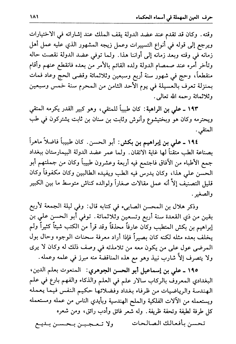 وقته وَكَانَ قَدْ تقدم عند عضد الدولة يقف الملك عند إشاراته فِي الاختيارات ويرجع إِلَى قوله فِي أنواع التسييرات وعمل زيجه المشهور الَّذِي عَلَيْهِ أهل زمانه فِي وقته وبعد زمانه إِلَى أواننا ها ولما توفي عضد الدولة تقصت حاله وتأخر أمره عند صمصام الدولة ولده القائم بالأمر من بعده فانقطع عنهم وأقام منقطعاً وحج فِي شهور سنة أربع وسبعين وثلاثمائة وقضى الحج وعاد فمات بمنزلة تعرف بالعسيلة فِي يوم الأحد الثامن من المحرم سنة خمس وسبعين وثلاثمائة رحمه الله تعالى.