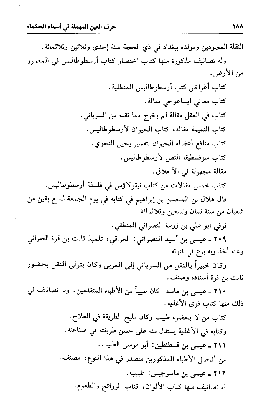 النقلة المجودين ومولده ببغداد فِي ذي الحجة سنة إحدى وثلاثين وثلاثمائة وَلَهُ تصانيف مذكورة منها. كتاب اختصار كتاب أرسطوطاليس فِي المعمور من الأرض. كتاب أغراض كتب أرسطوطاليس المنطقية. كتاب معاني ايساغوجي مقالة. كتاب فِي العقل مقالة لَمْ يخرج مما مقله من السرياني. كتاب النميمة مقالة. كتاب الحيوان لأرسطوطاليس. كتاب منافع أعضاء الحيوان بتفسير يحيى النحوي. كتاب سوقسطيا النص لأرسطوطاليس. مقالة مجهولة فِي الأخلاق. كتاب خمس مقالات من كتاب نيقولاؤس فِي فلسفة أرسطوطاليس قال هلال بن المحسن بن إبراهيم فِي كتابه فِي يوم الجمعة لسبع بقين من شعبان من سنة ثمان وتسعين وثلاثمائة توفي أبو علي بن زرعة النصراني المنطقي.