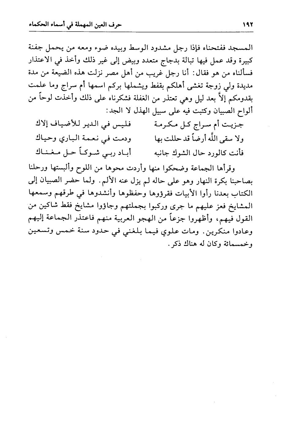 المسجد ففتحناه فإذا رجل مشدود الوسط وبيده ضوء ومعه من يحمل جفنة كبيرة وَقَدْ عمل فِيهَا نبالة بدجاج متعدد وبيض إِلَى غير ذَلِكَ وأخذ فِي الاعتذار فسألناه من هو فقال أنا رجل غريب من أهل مصر نزلت هَذِهِ الضيعة من مدة مديدة ولي زوجة تغشى أهلكم بقفط ويشملها بركم اسمها أم سراج وَمَا علمت بقدومكم إِلاَّ بعد ليل وهي تعتذر من الغفلة فشكرناه عَلَى ذَلِكَ وأخذت لوحاً من ألواح الصبيان وكتبت فِيهِ عَلَى سبيل الهذل لا الجد: