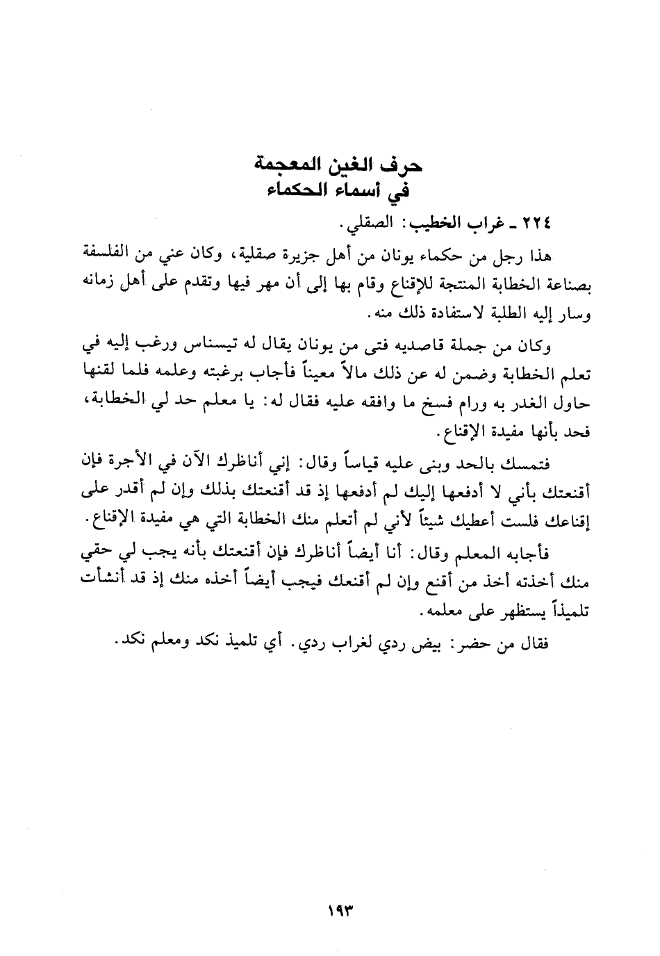 غراب الخطيب الصقلي هَذَا رجل من حكماء يونان من أهل جزيرة صقلية وَكَانَ عني من الفلسفة بصناعة الخطابة المنتجة للإقناع وقام بِهَا إِلَى أن مهر فِيهَا وتقدم عَلَى أهل زمانه وسار إِلَيْهِ الطلبة لاستفادة ذَلِكَ منه وَكَانَ من جملة قاصديه فتى من يونان يقال لَهُ تيسناس ورغب إِلَيْهِ فِي تعلم الخطابة وضمن لَهُ عن ذَلِكَ مالاً معيناً فأجاب برغبته وعلمه فلما لقتها حاول الغدر بِهِ ورام فسخ مَا وافقه عَلَيْهِ فقال لَهُ يَا معلم حد لي الخطابة فحد بأنها مفيدة الإقناع فتمسك بالحد وبنى عَلَيْهِ قياساً وقال إنني أناظرك الآن فِي الأجرة فإن أقنعتك بأني لا أدفعها إِلَيْكَ لَمْ أدفعها إذ قَدْ أقنعتك بذلك وأن لَمْ أقدر عَلَى إقناعك فلست أعطيك شيئاً لأني لَمْ أتعلم منك الخطابة الَّتِي هي مفيدة الإقناع فأجابه المعلم وقال أنا أيضاً أناظرك فإن أقنعتك بأنه يجب لي حقي منك أخذته أخذ من أقنع وإن لَمْ أقنعك فيجب أيضاً أخذه منك إذ قَدْ أنشأت تلميذاً يستظهر عَلَى معلمه فقال من حضر بيض ردي لغراب ردي أي تلميذ نكد ومعلم نكد.