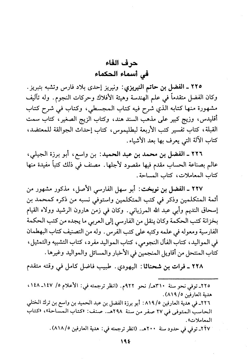 الفضل بن نوبخت أبو سهل الفارسي الأصل مذكور مشهور من أئمة المتكلمين وذكر فِي كتب المتكلمين واستوفي نسبه من ذكره كمحمد بن إسحاق النديم وأبي عبد الله المرزباني وَكَانَ فِي زمن هارون الرشيد وولاه القيام بخزانة كتب الحكمة وَكَانَ ينقل من الفارسي إِلَى العربي مَا يجده من كتب الحكمة الفارسية ومعوله فِي علمه وكتبه عَلَى كتب الفرس وَلَهُ من التصنيف كتاب البهطمان فِي المواليد. كتاب الفأل النجومي. كتاب المواليد مفرد. كتاب التشبيه والتمثيل. كتاب المنتحل من أقاويل المنجمين فِي الأخبار والمسائل والمواليد وغيرها.