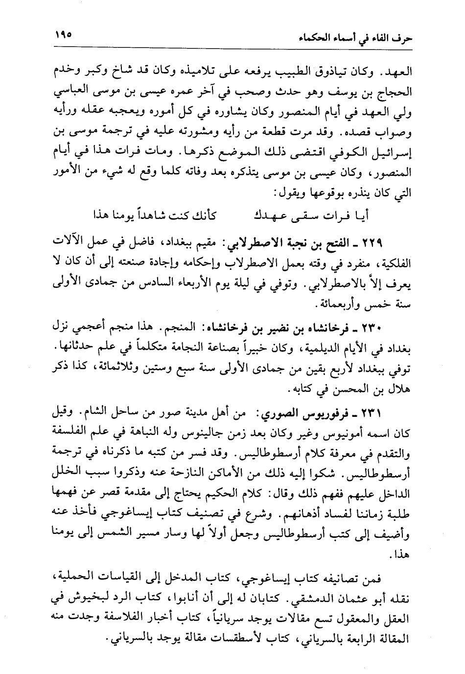 فرفوريوس الصوري من أهل مدينة صور من ساحل الشام وقيل كَانَ اسمه أمونيوس وغير وَكَانَ بعد زمن جالينوس وَلَهُ النباهة فِي علم الفلسفة والتقدم فِي معرفة كلام أرسطوطاليس وَقَدْ فسر من كتبه مَا ذكرناه فِي ترجمة أرسطوطاليس شكوا إِلَيْهِ ذَلِكَ من الأماكن النازحة عنه وذكروا سبب الخلل الداخل عليهم ففهم ذَلِكَ وقال كلام الحكيم يحتاج إِلَى مقدمة قصر عن فهمها طلبة زماننا لفساد أذهانهم وشرع فِي تصنيف كتاب ايساغوجي فأخذ عنه وأضيف إِلَى كتب أرسطوطاليس وجعل أولاً لَهَا وسار مسير الشمس إِلَى يومنا هَذَا.