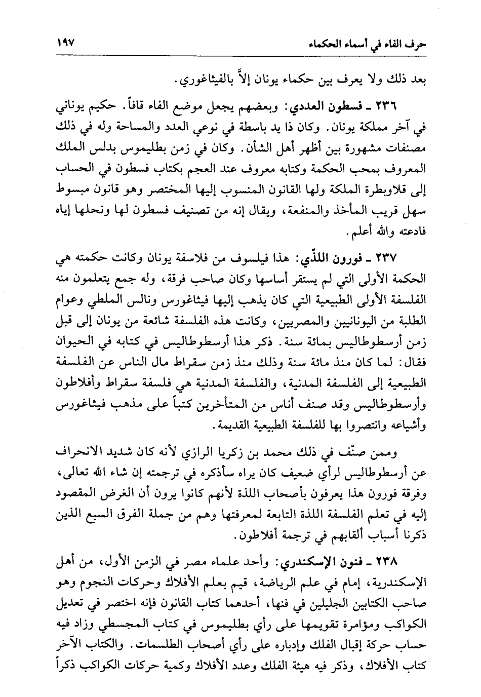 فورون اللَّذِي هَذَا فيلسوف من فلاسفة يونان وَكَانَتْ حكمته هي الحكمة الأولى الَّتِي لَمْ يستقر أساسها وَكَانَ صاحب فرقة وَلَهُ جمع يتعلمون من الفلسفة الأولى الطبيعية الَّتِي كَانَ يذهب إِلَيْهَا فيثاغورس وثالس الملطي وعوام الطلبة من اليونانيين والمصريين وَكَانَتْ هَذِهِ الفلسفة شائعة من يونان إِلَى قبل زمن أرسطوطاليس بمائة سنة ذكر هَذَا أرسطوطاليس فِي كتابه فِي الحيوان فقال لما كَانَ منذ مائة سنة وذلك منذ زمن سقراط مال الناس عن الفلسفة الطبيعية إِلَى الفلسفة المدنية والفلسفة المدنية هي فلسفة سقراط وأفلاطون وأرسطوطاليس وَقَدْ صنف أناس من المتأخرين كتباً عَلَى مذهب فيثاغورس وأشياعه وانتصروا بِهَا للفلسفة الطبيعية القديمة وممن صنف فِي ذَلِكَ محمد بن زكريا الرازي لأنه كَانَ شديد الانحراف عن أرسطوطاليس لرأي ضعيف كَانَ يراه سأذكره فِي ترجمته إِن شاء الله تعالى وفرقة فورون هَذَا يعرفون بأصحاب اللذة لأنهم كانوا يرون أن الغرض المقصود إِلَيْهِ فِي تعلم الفلسفة اللذة التابعة لمعرفتها وهم من جملة الفرق السبع الذين ذكرنا أسباب ألقابهم فِي ترجمة أفلاطون.