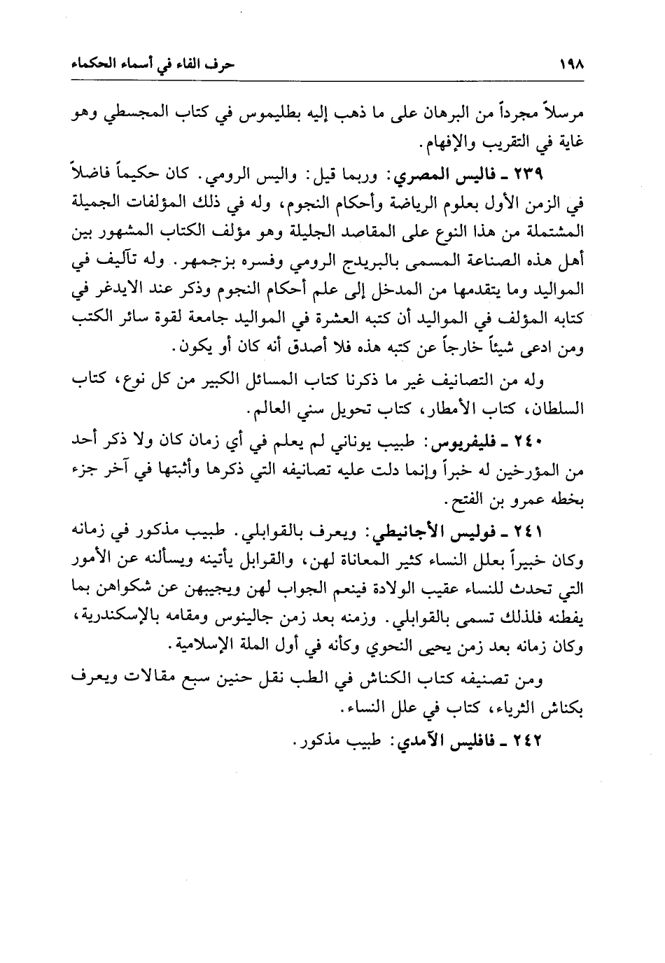 فاليس المصري وربما قيل واليس الرومي كَانَ حكيماً فاضلاً فِي الزمن الأول بعلوم الرياضة وأحكام وَلَهُ فِي ذَلِكَ المؤلفات الجميلة المشتملة من هَذَا النوع عَلَى المقاصد الجليلة وهو مؤلف الكتاب المشهور بَيْنَ أهل هَذِهِ الصناعة المسمى بالبريدج الرومي وفسره بزجمهر وَلَهُ تآليف فِي المواليد وَمَا يتقدمها من المدخل إِلَى علم أحكام المجوم وذكر عند الايدغر فِي كتابه المؤلف فِي المواليد أن كتبه العشرة فِي المواليد جامعة لقوة سائر الكتب ومن ادعى شيئاً خارجاً عن كتبه هَذِهِ فلا أصدق أنه كَانَ أَوْ يكون وَلَهُ من التصانيف غير مَا ذكرناه كتاب المسائل الكبير من كل نوع. كتاب السلطان. كتاب الأمطار. كتاب تحويل سني العالم.