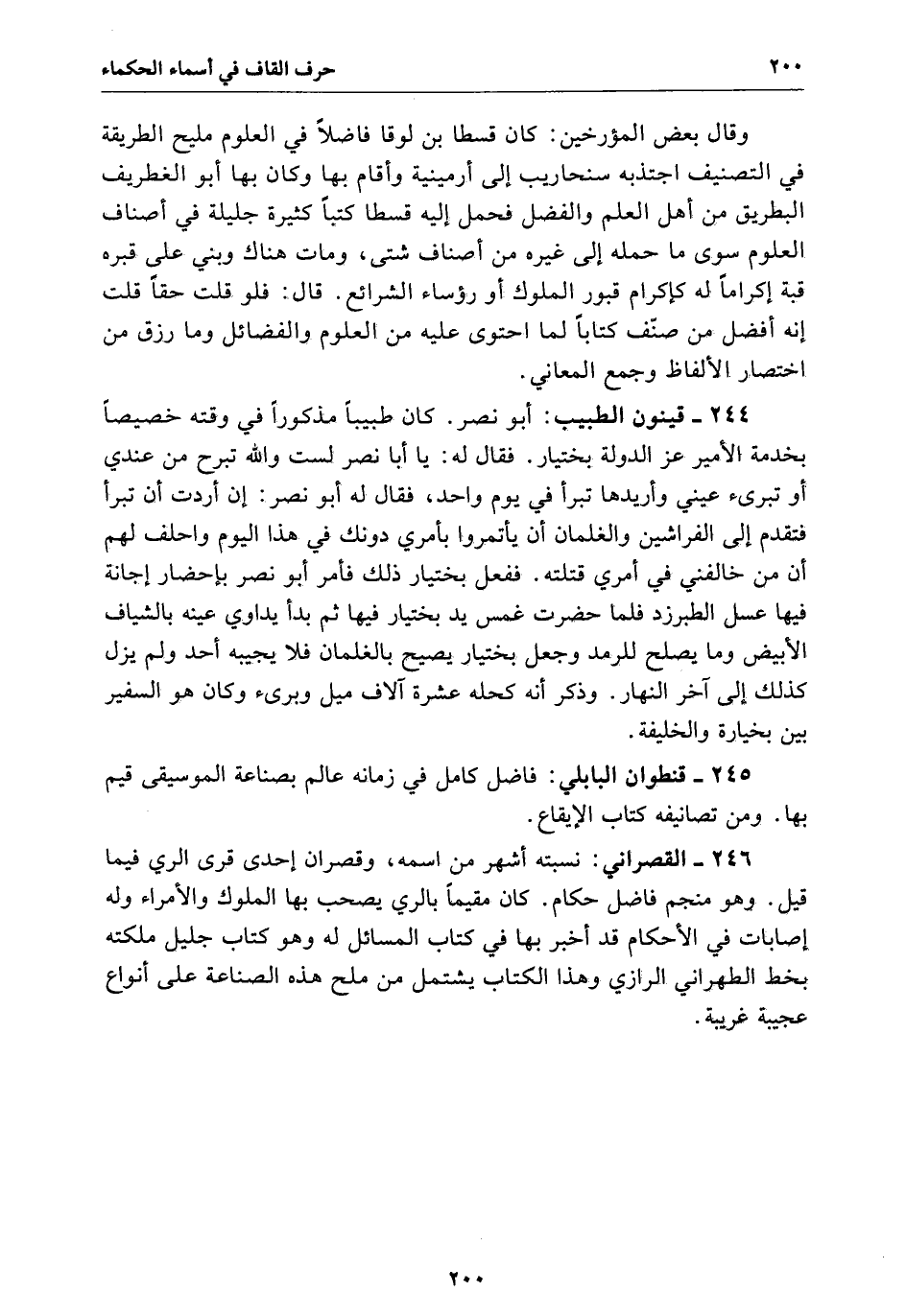 القصراني نسبته أشهر من اسمه وقصران إحدى قرى الري فيما قيل وهو منجم فاضل حكام كَانَ مقيماً بالري يصحب بِهَا الملوك والأمراء وَلَهُ إصابات فِي الأحكام قَدْ أخبر يها فِي كتاب المسائل لَهُ وهو كتاب جليل ملكته بخط الطهراني الرازي وهذا الكتاب يشتمل من ملح هَذِهِ الصناعة عَلَى أنواع عجيبة غريبة.