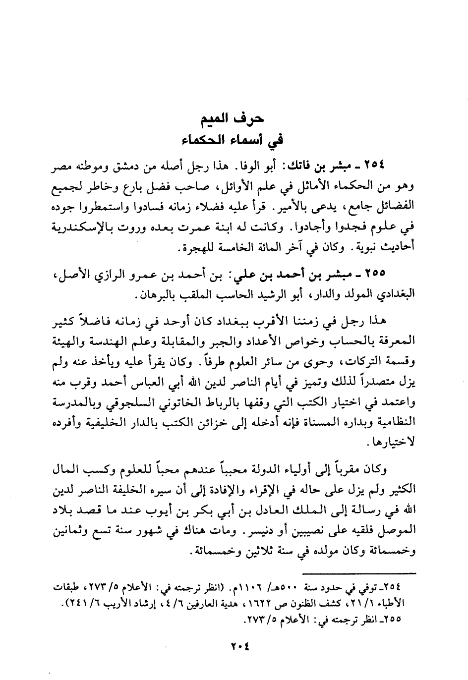 مبشر بن فاتك أبو الوفا هَذَا رجل أصله من دمشق وموطنه مصر وهو من الحكماء الأماثل فِي علم الأوائل صاحب فضل بارع وخاطر لجميع الفضائل جامع يدعي بالأمير قرأ عَلَيْهِ فضلاء زمانه فسادوا واستمطروا جوده فِي علوم فجدوا وأجادوا وَكَانَتْ لَهُ ابنة عمرت بعده وروت بالإسكندرية أحاديث نبوية وَكَانَ فِي آخر المائة الخامسة للهجرة.