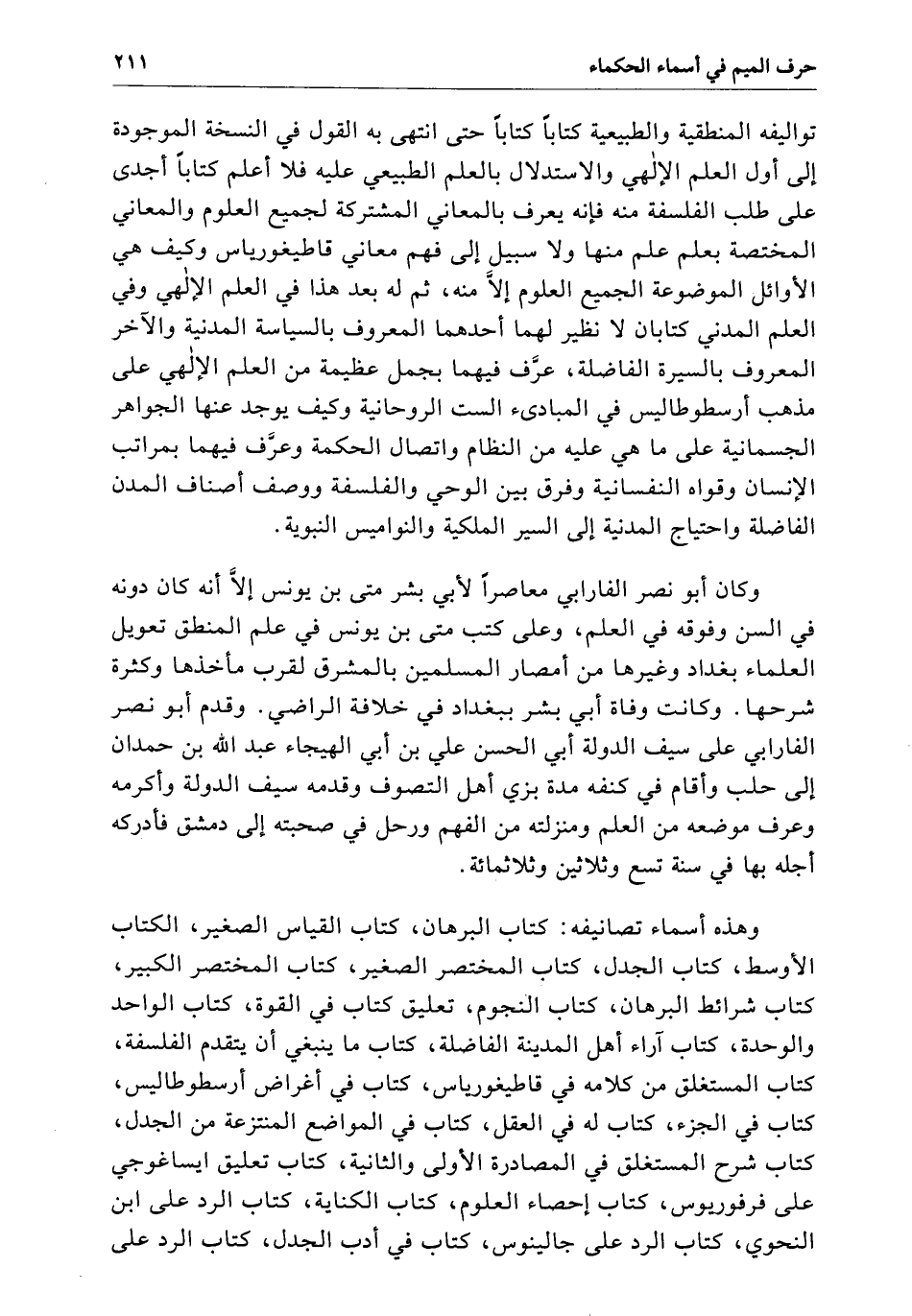 تواليفه المنطقية والطبيعية كتاباً كتاباً حَتَّى انتهى بِهِ القول فِي النسخة الموجدة إِلَى أول العلم الإلهي والاستدلال بالعلم الطبيعي عَلَيْهِ فلا أعلم كتاباً إحدى عَلَى طلب الفلسفة منه فإنه يعرف بالمعاني المشتركة لجميع العلوم والمعاني المختصة يعلم علم منها ولا سبيل إِلَى فهم معاني قاطيغورياس وكيف هي الأوائل الموضوعة الجميع العلوم إِلاَّ منه بعد هَذَا فِي العلم الآلهي وَفِي العلم المدني كتابان لا نظير لهما أحدهما المعروف بالسياسة المدنية والآخر المعروف بالسيرة الفاضلة عرف فيهما بجمل عظيمة من العلم الآلهي عَلَى مذهب أرسطوطاليس فِي المبادئ الست الروحانية وكيف يوجد عنها الجواهر الجسمانية عَلَى مَا هي عَلَيْهِ من النظام واتصال الحكمة عرف فيهما بمراتب الإنسان وقواه النفسانية وفرق بَيْنَ الوحي والفلسفة ووصف أصناف المدن الفاضلة واحتياج المدنية إِلَى السير الملكية والنواميس النبوية .. وَكَانَ أبو نصر الفارابي معاصراً لأبي بشر متي بن يونس إِلاَّ أنه كَانَ دونه فِي السن وقوفه فِي العلم وَعَلَى كتب متي بن يونس فِي علم المنطق تعويل العلماء ببغداد وغيرها من أمصار المسلمين بالمشرق لقرب مأخذها وكثرة شرحها وَكَانَتْ وفاة أبي بشر ببغداد فِي خلافة الراضي .. وقدم أبو نصر الفارابي عَلَى صيف الدولة أبي الحسن علي بن أبي الهيجاء عبد الله بن حمدان إِلَى حلب وأقام فِي كنفه مدة بزي أهل التصوف وقدمه سيف الدولة وأكرمه وعرف موضعه من العلم ومنزلته من الفهم ورحل إِلَى صحبته إِلَى دمشق فأدركه أجله بِهَا فِي سنة تسع وثلاثين وثلاثمائة وهذه أسماء تصانيفه. كتاب البرهان. كتاب القياس الصغير. كتاب الأوسط. كتاب الجدل. كتاب المختصر الصغير. كتاب المختصر الكبير. كتاب شرائط البرهان. كتاب النجوم. تعليق كتاب فِي القوة. كتاب الواحد والوحدة. كتاب آراء المدينة الفاضلة. كتاب مَا ينبغي أن يتقدم الفلسفة. كتاب المستغلق من كلامه فِي قاطيغورياس. كتاب فِي أغراض أرسطوطاليس. كتاب فِي الجزء. كتاب لَهُ فِي العقل. كتاب فِي المواضع المنتزعة من الجدل. كتاب شرح المستغلق فِي المصادرة الأولى والثانية. كتاب تعليق ايساغوجي عَلَى فرقوريوس. كتاب إحصاء العلوم. كتاب الكتابة. كتاب الرد عَلَى ابن النحو. كتاب الرد عَلَى جالينوس. كتاب فِي أدب الجدل. كتاب الرد عَلَى